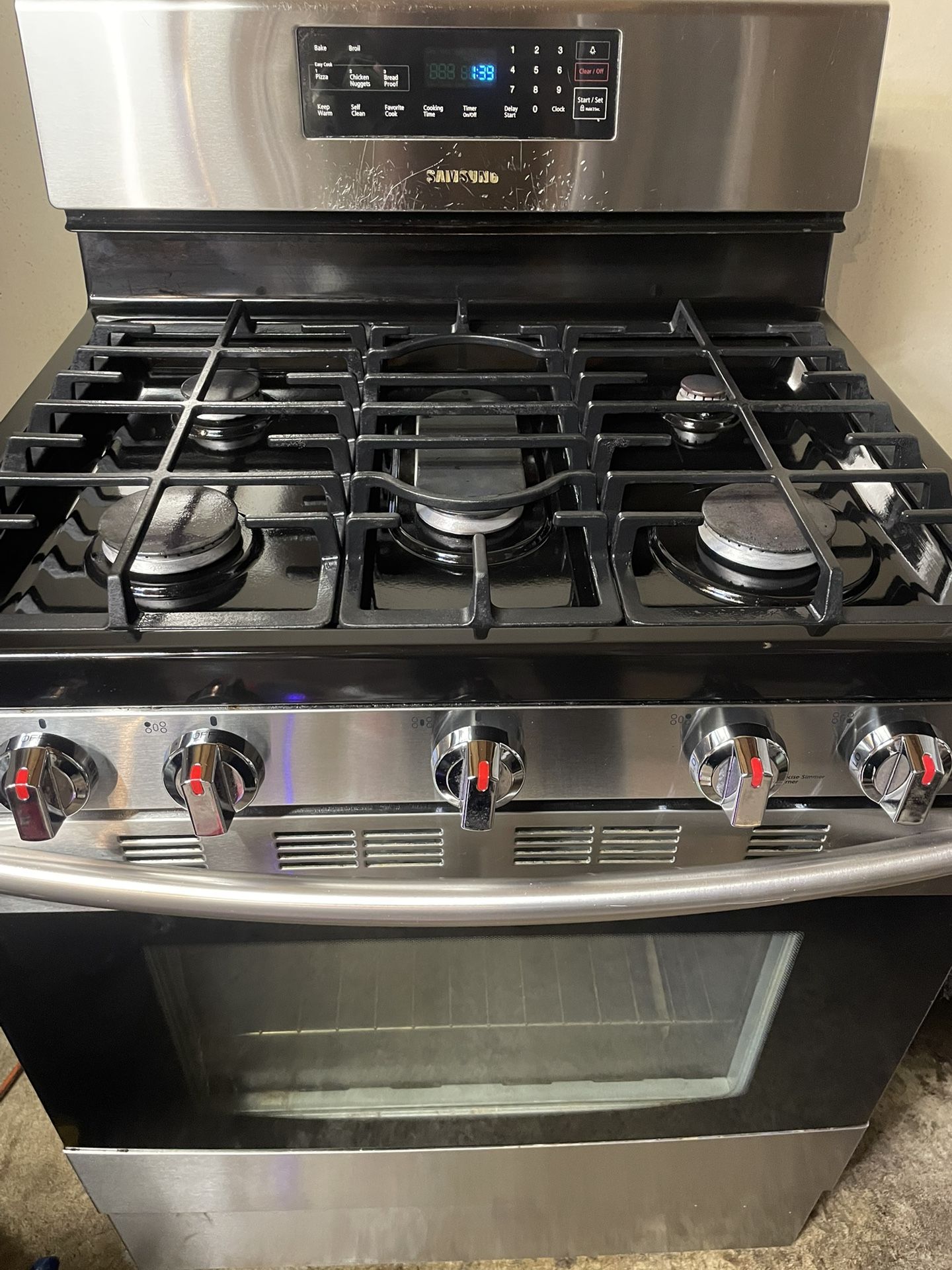 Samsung 5 burner stainless steel gas stove all burners and oven/broil in working order can test at pick up can deliver and install for extra with deposit before hand 30 way warranty on all appliances have multi appliances for sale