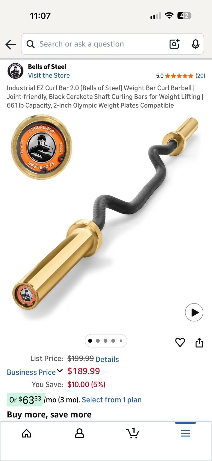 Like New Condition Industrial EZ Curl Bar 2.0 [Bells of Steel] Weight Bar Curl Barbell | Joint-friendly, Black Cerakote Shaft Curling Bars for Weight Lifting | 661 lb Capacity, 2-Inch Olympic Weight Plates Compatible | Volcano Knurling