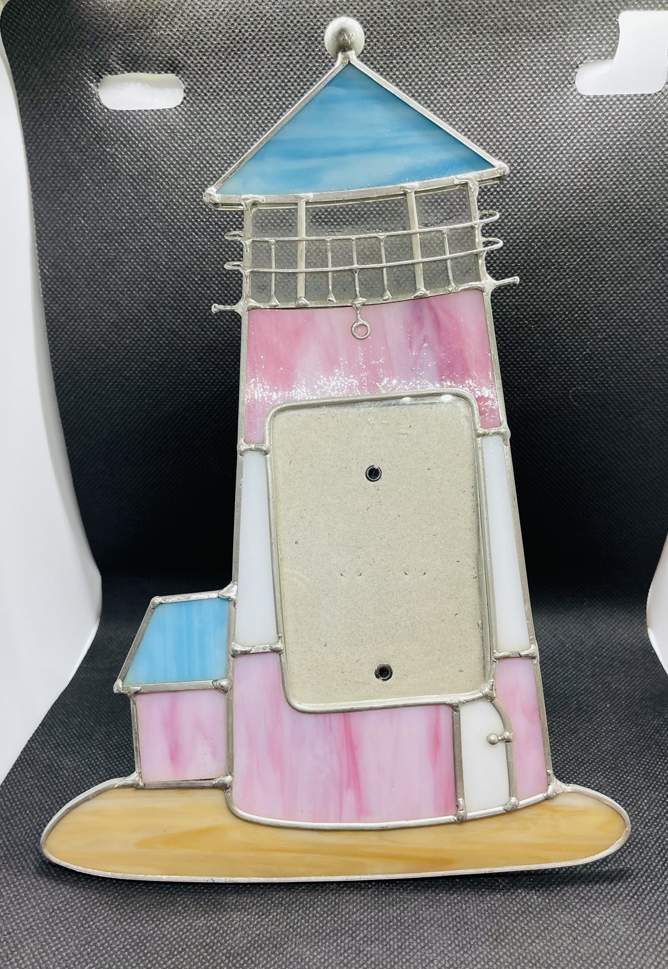 Beautiful vintage stained glass lighthouse picture frame with pink/blue/white color panels. Accented with beige base and outlined with silver edging. This can be hung with the attached hanger, or set on a desk. Picture frame 3.25” T X 2.25”W Lighthouse 9.75” T X 6.75”W Beautiful addition to any decor or child’s room