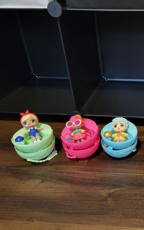 3 LOL Dolls. The one on the right is from season 1 of the Boys series. The other 2 are both from season 2 of the regular series. The girls are both in excellent condition and look like they are new. The boy is in excellent condition too but his shoes are missing.