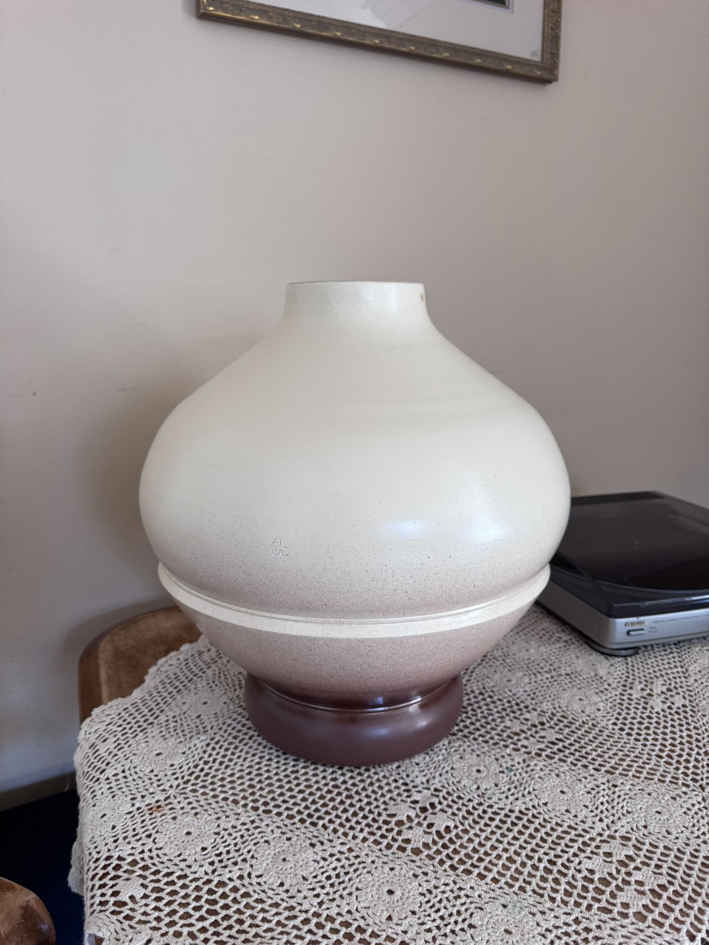 Large, very heavy ceramic piece with a wide opening and hole at the bottom. Material feels like thick ceramic or stoneware. Originally found as part of home decor — exact original purpose is unknown. May have been used as a decorative lamp shade, planter, or interior design piece. • Very heavy • Neutral cream and brown tones • Solid, thick walls • Hole at the bottom • No cracks, no chips (see photos) • Sold as-is Great for: – DIY or creative projects – Decor, studio, or prop use – Repurposing as planter or art object Please review all photos for size and details