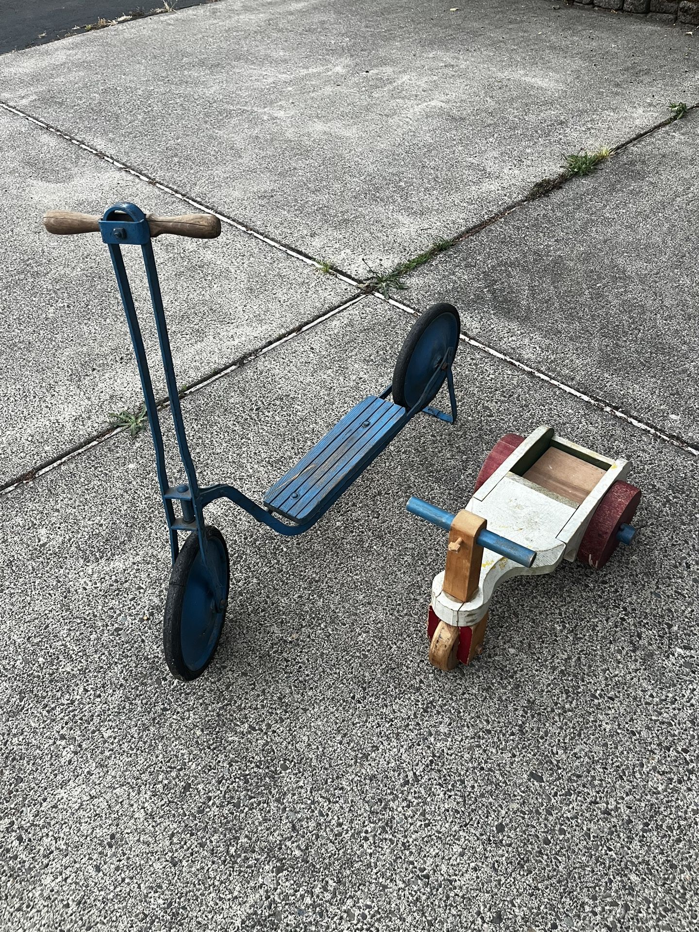 Vintage scooter with a built-in stand. Kids still ride it! 31” tall at top of handlebars. About 39-40”long. 10 “tires. 4.5”wide foot bar. Looks like it was red at one time, then painted blue. Cute little three wheeled riding toy. Believe it is handmade. 7” tall at the seat. Handlebars about 13.5” tall. 22” long and 7.25” wide. The front wheel turns, but gets a little stuck in one spot. Looks like the front piece that holds the handlebars was replaced. There is a hand made wood piece that sits in the cargo part of the back. These belonged to my mother-in-law. They are probably from around the 1940s. Her father made most of her toys, so we believe he made the three wheeled toy and did some work on the scooter. Porch pick up.