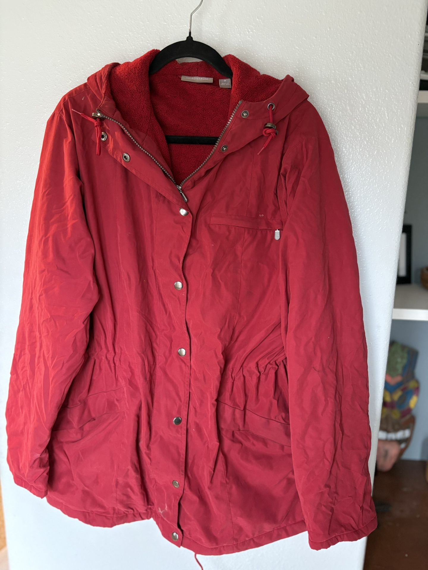 Red Women’s Nordstrom Jacket with hood Small stain at bottom in front.