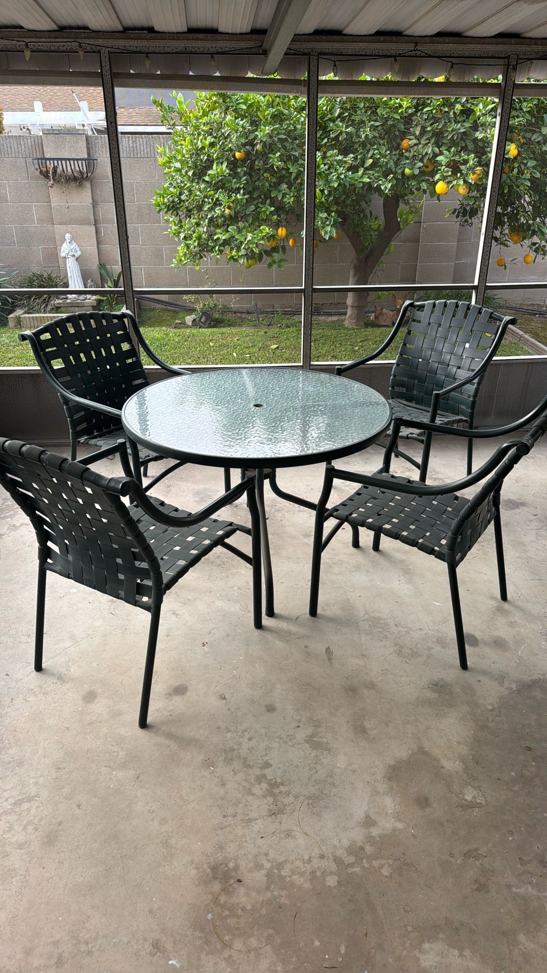 Forest green patio table with frosted glass top and 4 strapped chairs.