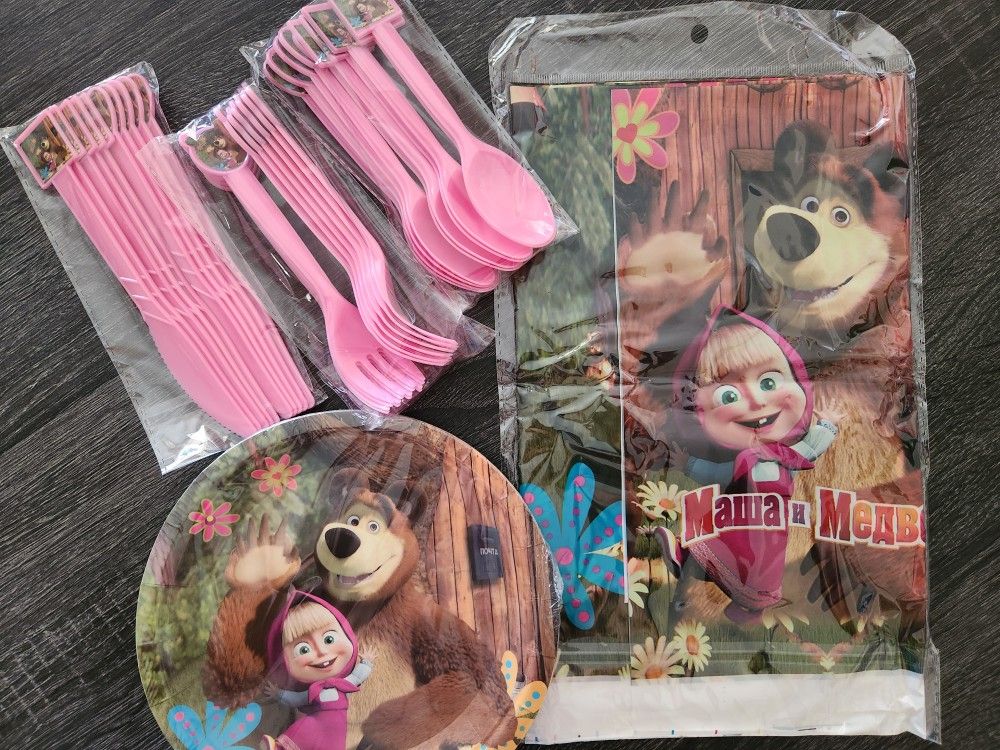 Mighty Mojo Masha and The Bear $6 Table cover 1 pk of plates sm 3 pk of Utensils 10cts each Box.2
