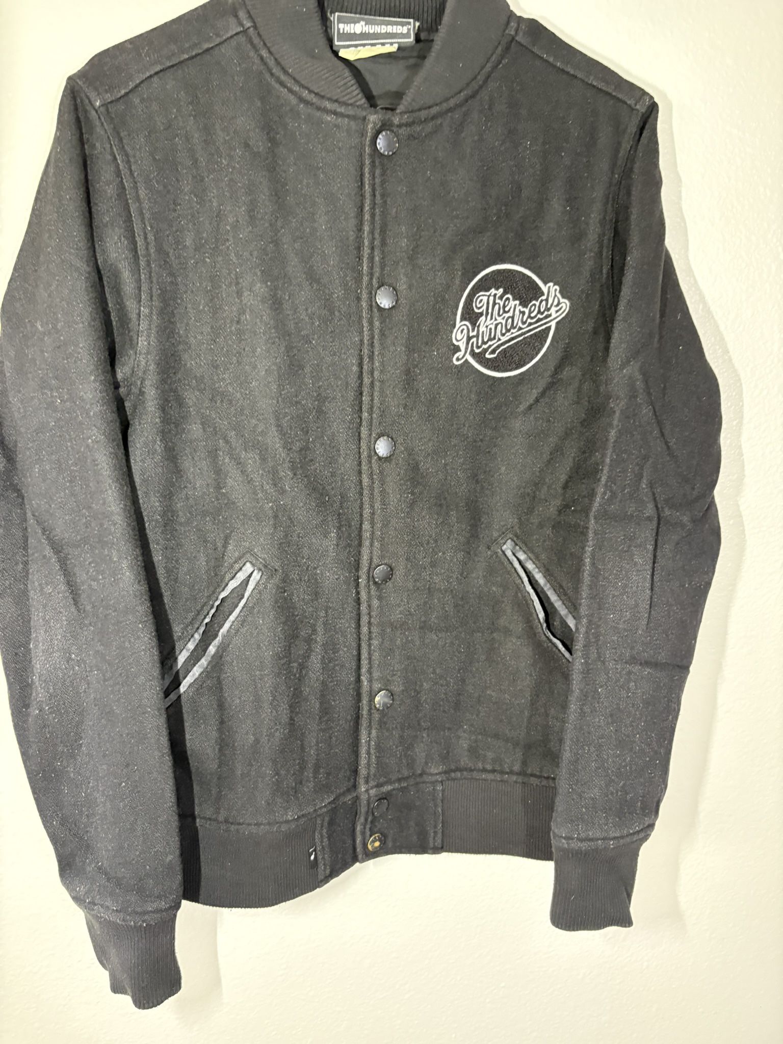 in good cosmetic condition The Hundreds varsity jacket sz Small. No major flaws as shown on pictures, see all pictures for details and condition what you see is what you get. Bin #20 Measurements Length 26 1/2” pit to pit 20 1/2” Retro Jacket The Hundreds Varsity Letterman