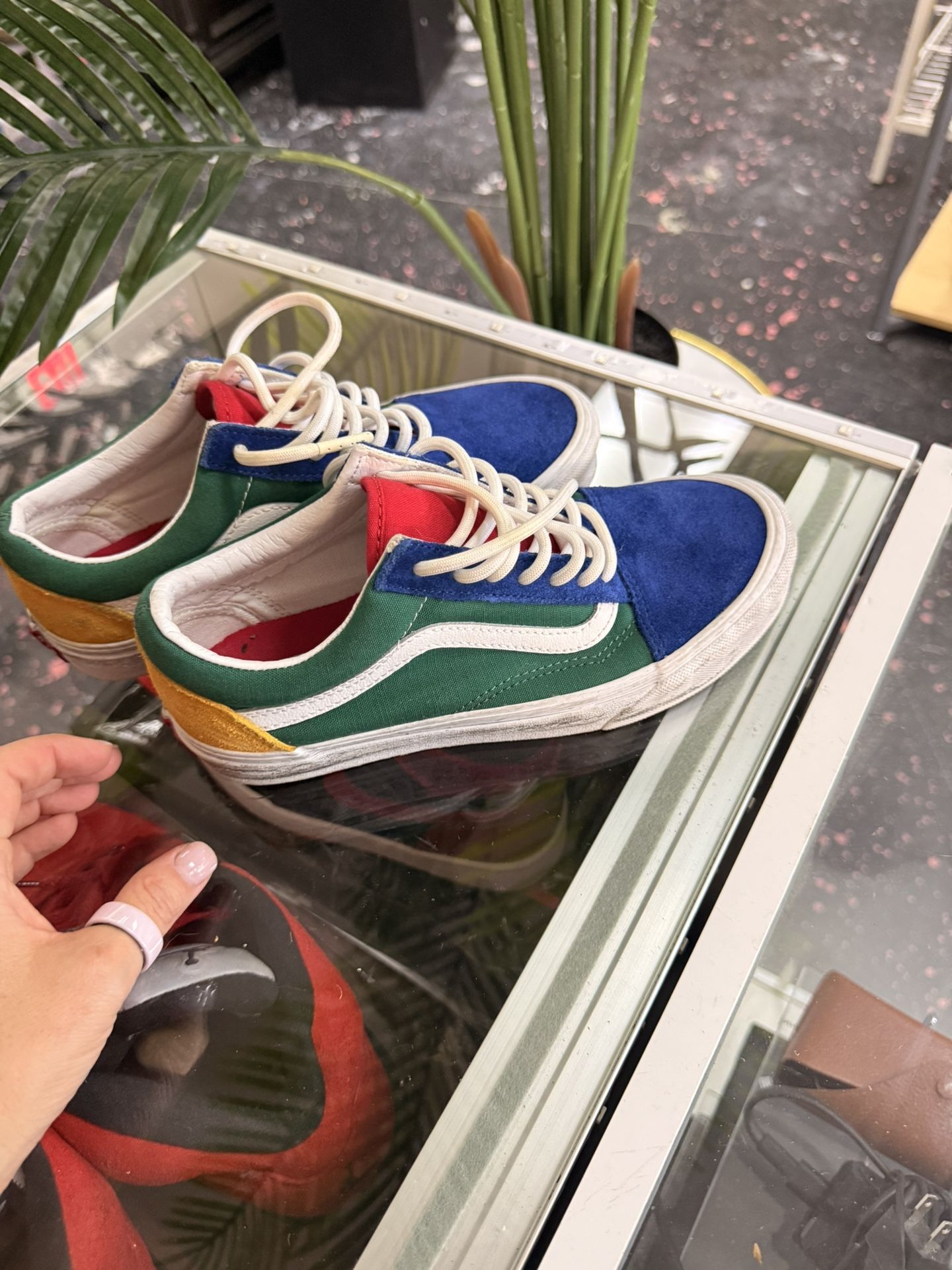 Colorful Vans Old Skool kicks. These have a cool multi-color design with blue, green, yellow, and red panels. Made with suede and canvas. Classic style and comfy. ReVibe Thrift Shop Weekend appointment only π± (contact info removed) β text to book an appointment