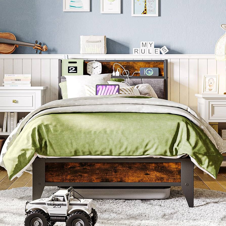 Twin Size Bed Frame and Headboard with Charging Station, Twin Bed Frame with Storage, Heavy Duty Steel Support, No Box Spring Needed, Squeak Resistant