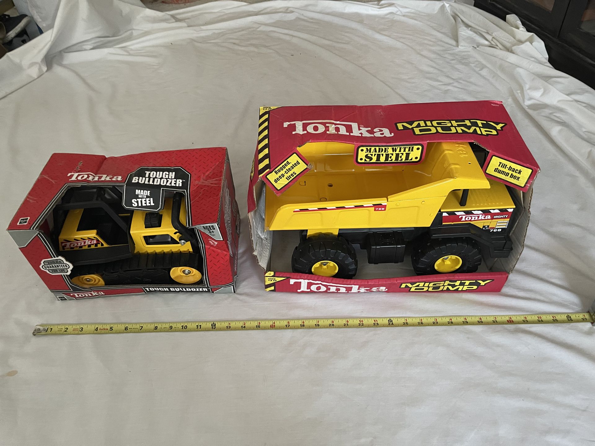 1990s still in the box solid steel scale 1/16 Tonka super dump truck with Tonka super bulldozer toys