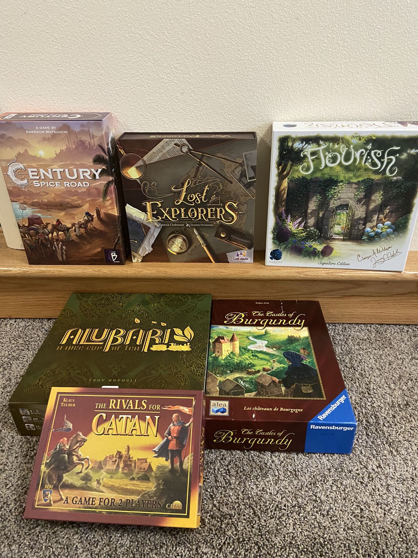 This is a great bundle of games and could also make an awesome starter set of games. With classics like Castles of Burgundy (all time favorite, just upgraded to a deluxe version) and new games such as Flourish, this is a well rounded set. Looking to sell as a bundle. All games are in excellent condition, well cared for, and all are complete (nothing missing). Discounted: Asking $80 for the lot (averaging $13/each which is lowered than you will pay for any of these if you buy them new or used at a game store). Games: Castles of Burgundy Lost Explorers - never played Settlers of Catan (two person game) Flourish Century Spice Road Alubari