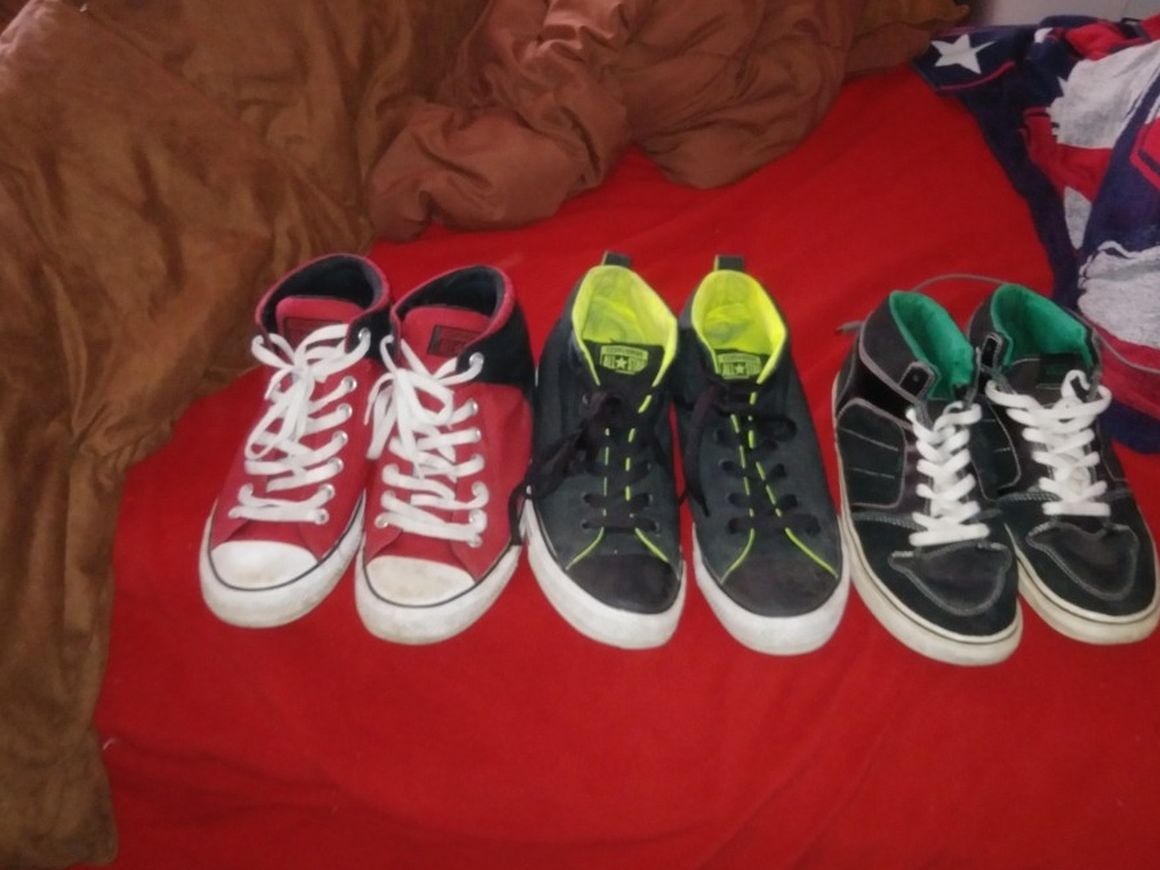 3 pairs of mens shoes All size 10 Red and White Converse - 10$ Yellow/Green and Black Converse - 10$ Green and Black Converse - 10$ All together for 30$