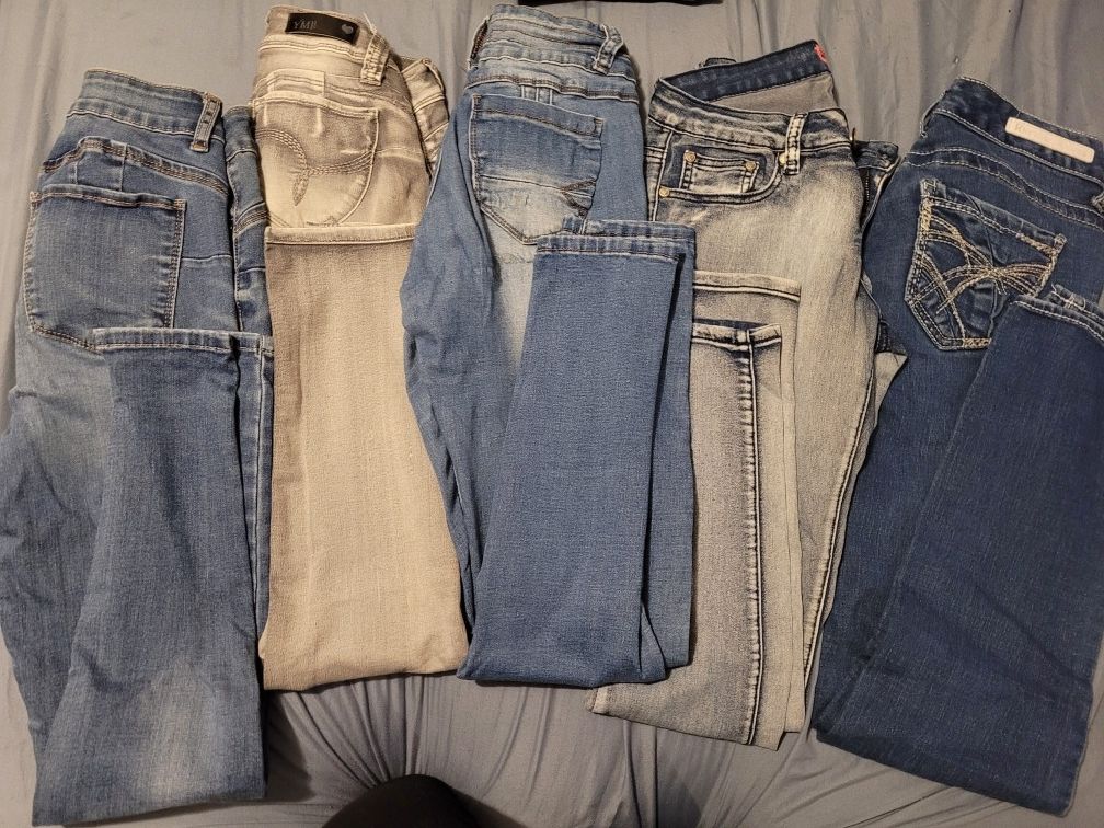 Lot of 5 pairs of juniors jeans all in really good condition. They just don't fit anymore. Willing to discuss if you only want to buy 2 or 3 pairs. From left: 1)size 5 butt...i love you wax jeans. Butt enhancing jeans. 2) wanna betta butt? Ymi size 5 comfy and buty enhancing. 3) size 5 bamboo butt enhancing jeans. 4) believe in you size 5/6 thin and comfy jeans 5) rythym in blues skinny jeans, say size 2, i think they fit more like a 5 or so.