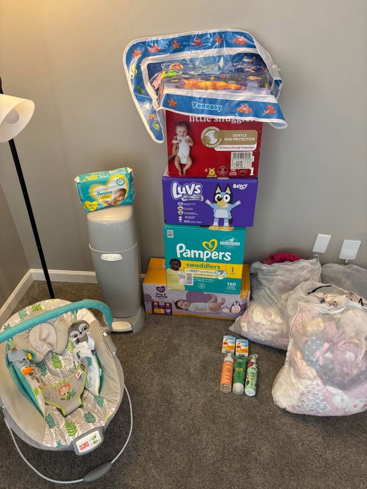 Price is firm. This bundle includes baby chair, tummy time fill up water mat, 4 boxes of new diapers and one small diaper bag of premie diapers, new diaper genie, 5 bags of new and used girl clothes and shoes 0-9 months, and some hair products with some new vitamin D drops.