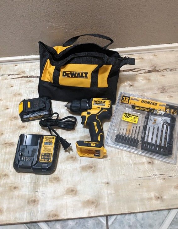 Like new Battery and charger included Drill bit kit included 20v brushless Lithium ion Atomic compact series 1/2"