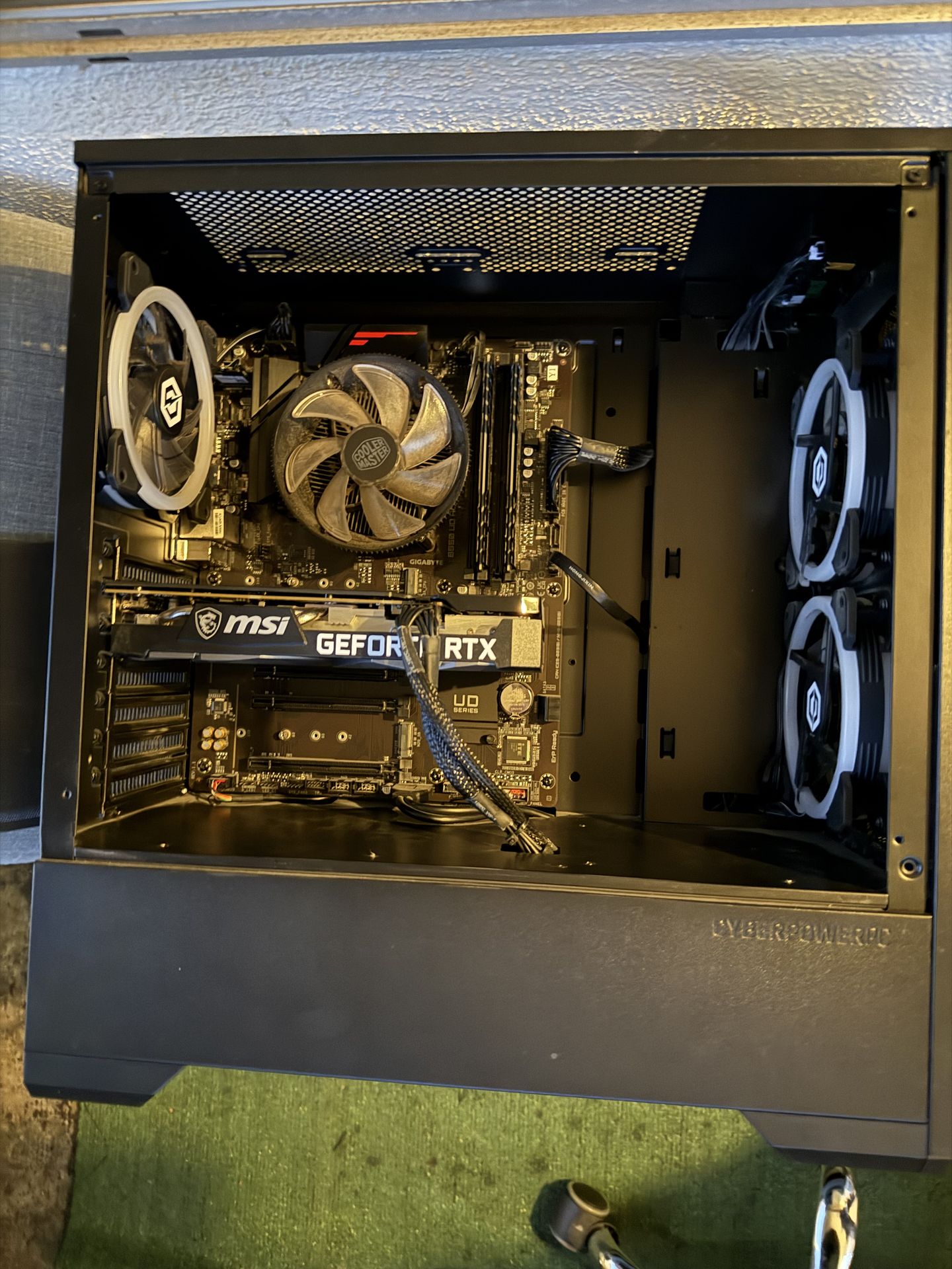 Powerful gaming PC for sale. Has AMD Ryzen 5 5500 CPU, 16GB memory, NVIDIA Geforce RTX 3060 GPU, and 1TB SSD. CYBERPOWERPC case. Cooler Master CPU fan and MSI motherboard inside. Has cool RGB fans.