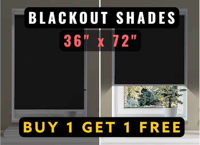 $ BUY 1 GET 1 FREE $ No Tools or Drills are needed. BLACKOUT (36" x 72") Cordless Roller Shades Also includes an instruction manual. Both of those blackout shades are Brand New with all of the necessary hardware for proper installation. 36''W x 72''L Thermal Insulated UV Protection Waterproof Roll Up Window Blinds for Windows & Blinds width will 1/5" narrower for a snug internal installation. Actual Blinds Size is 35 4/5" W x 72" H. Choose the size SAME or CLOSEST to your window width for INSIDE mount. For Example, if your windows are 30" wide, order 30" or slightly less for internal installation. For OUTSIDE mount, we recommend order (2-4)inch wider than your window width for better coverage. For Example, if your windows width is 30", order size 34" would be okay for outside mount. ⭐(Pls Note) Fabric width is 1 4/5" narrower than the shades. For INSIDE mount, window frame should have at least 1 1/5” depth. Shades height can adjust from 0" to 72"