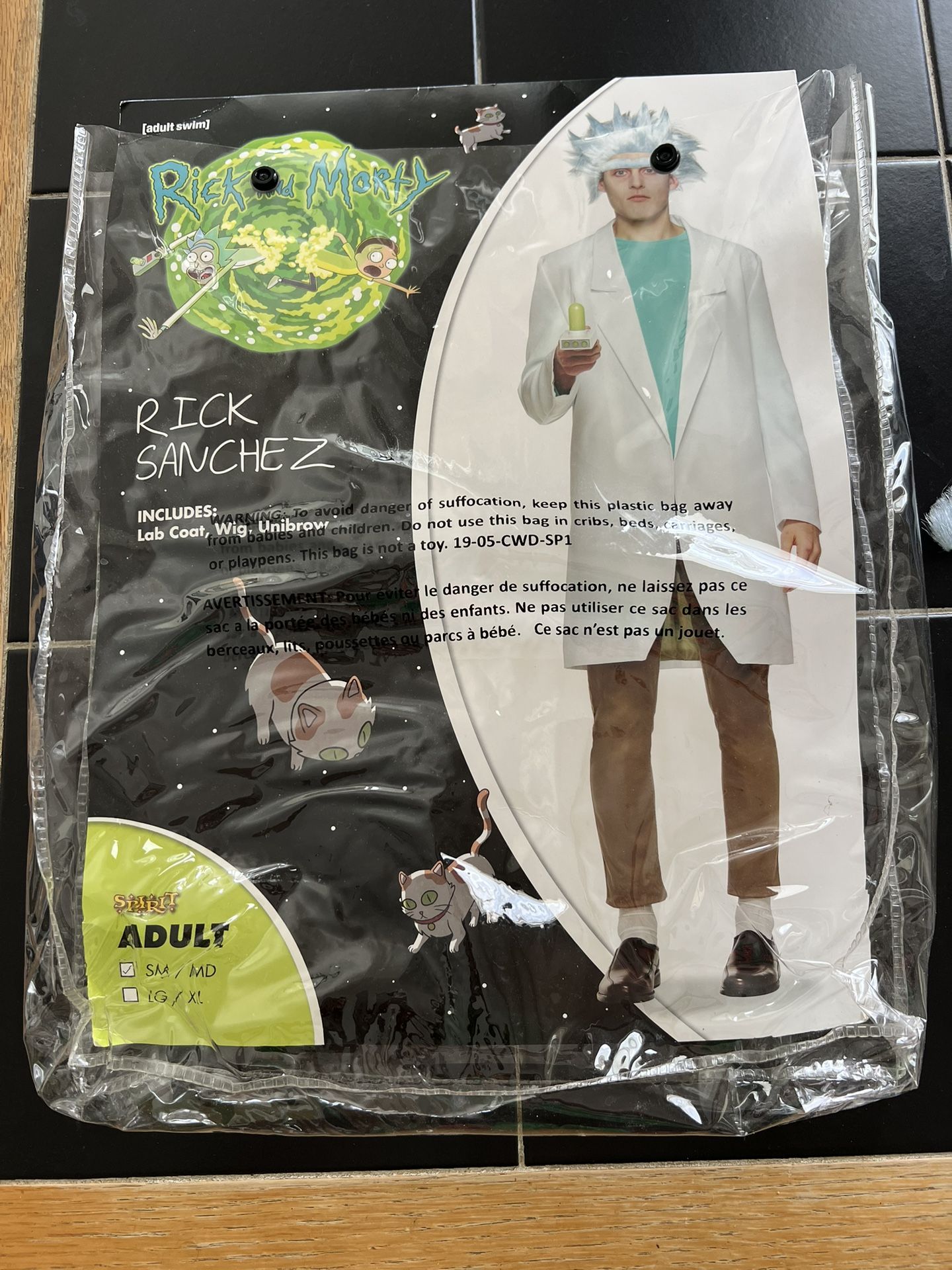 SM/MD Rick and Morty Includes: lab coat, Wig,Unibrow Used like new In good condition Usable for Halloween