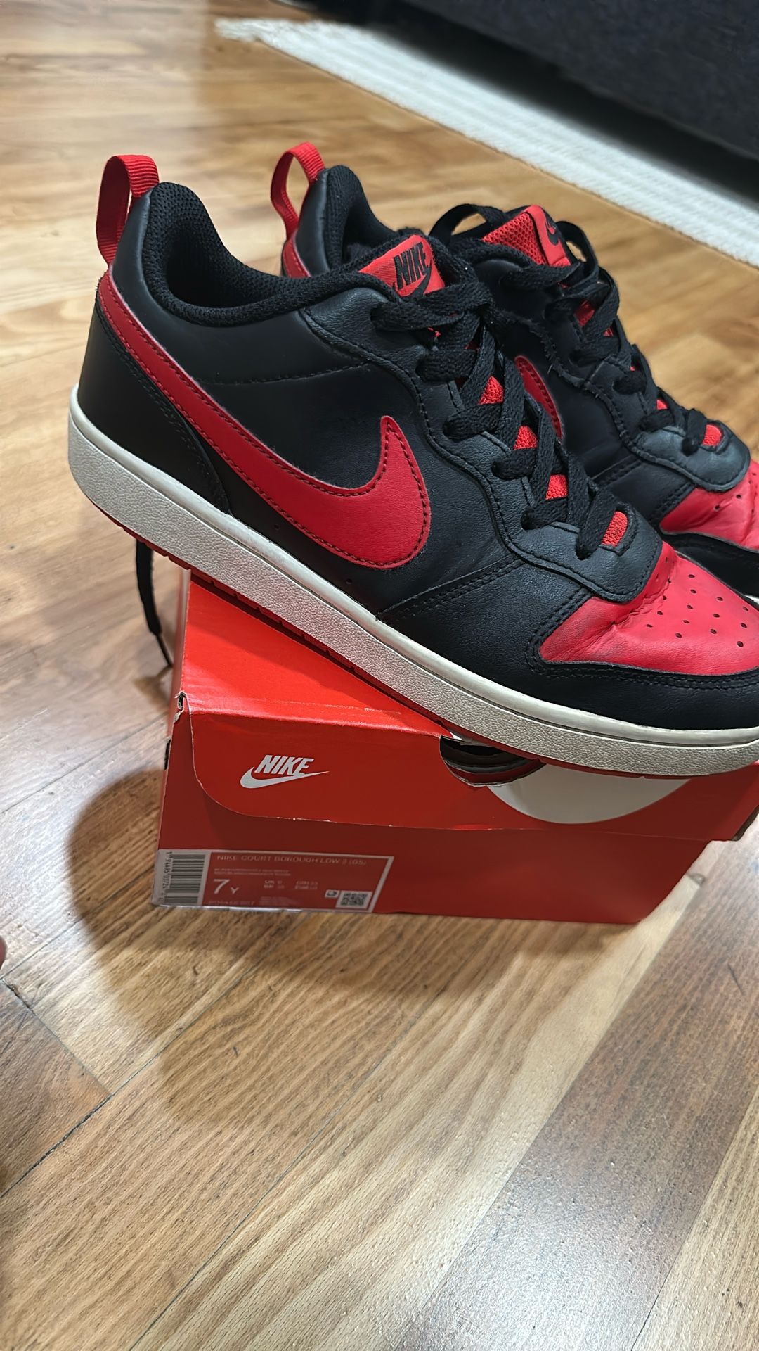 Black and university red, 7Y, Nike court borough low 2. Son outgrew them. Used but still in good condition. Asking $25. Pick up only