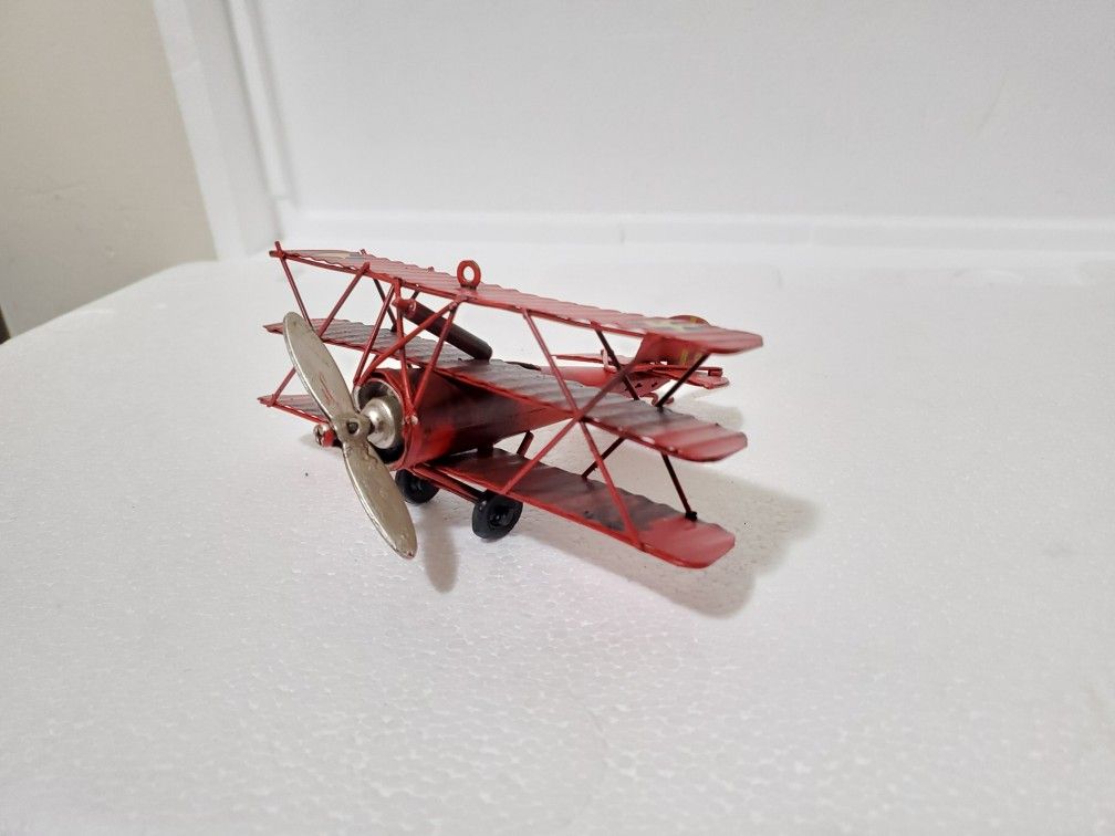 Bring a touch of aviation history to your collection with this vintage-style red biplane model airplane. Crafted from durable metal and hand-painted in a bold red finish, this collectible captures the charm of early 20th-century aircraft. Features: Classic biplane design with double wings Metal construction with painted details Fixed silver-tone propeller and detailed landing gear Accented with star insignia and tail stripes Perfect for display, aviation collectors, or vintage décor Dimensions: 2.45" H x 6" W x 5.4" D WATCH video of exact condition of the item!!!