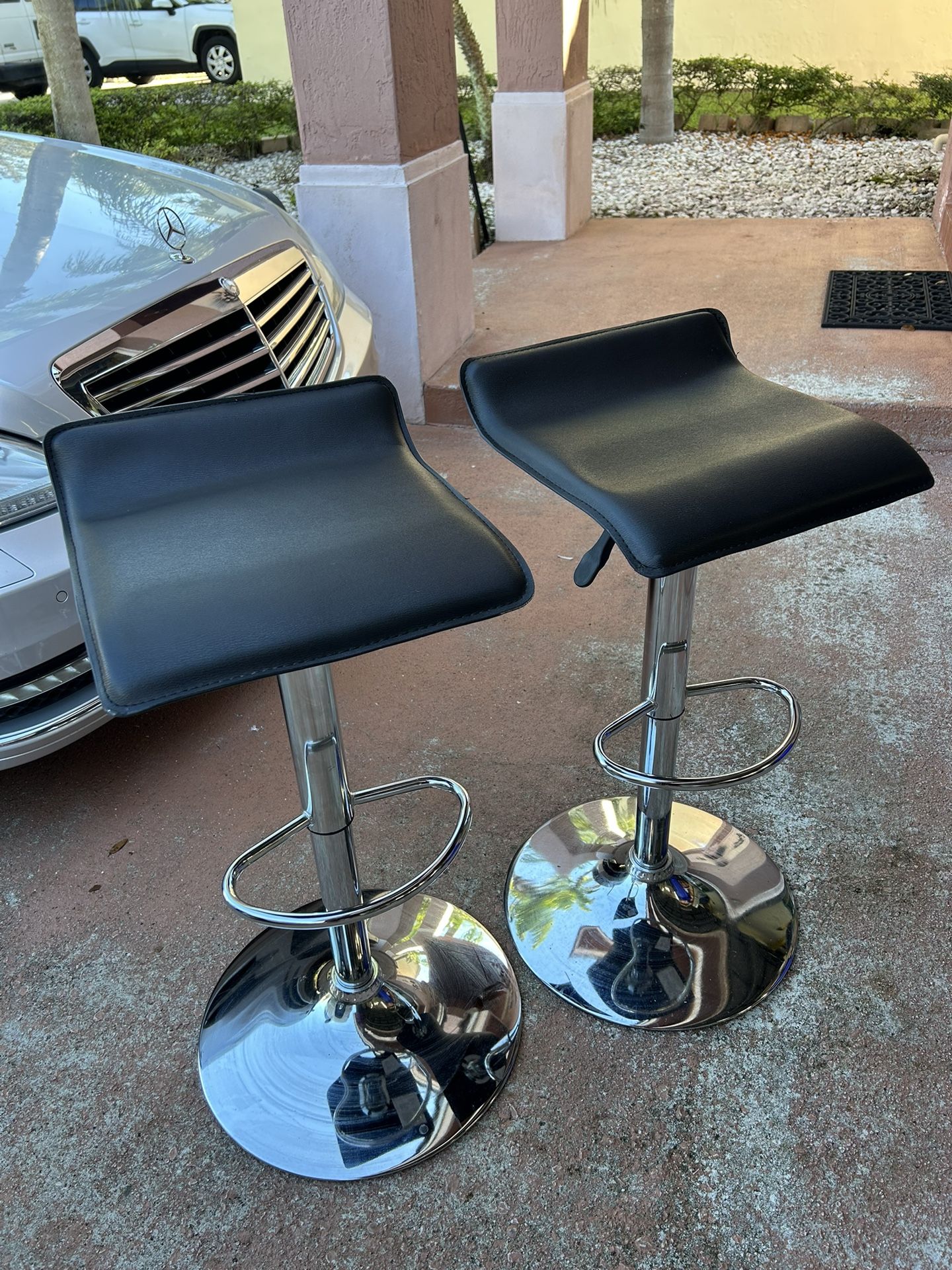 Slightly used Almost new 2 low back black leather adjustable height barstools retails for $100 each my price $30 each. Beautiful contemporary leather design.