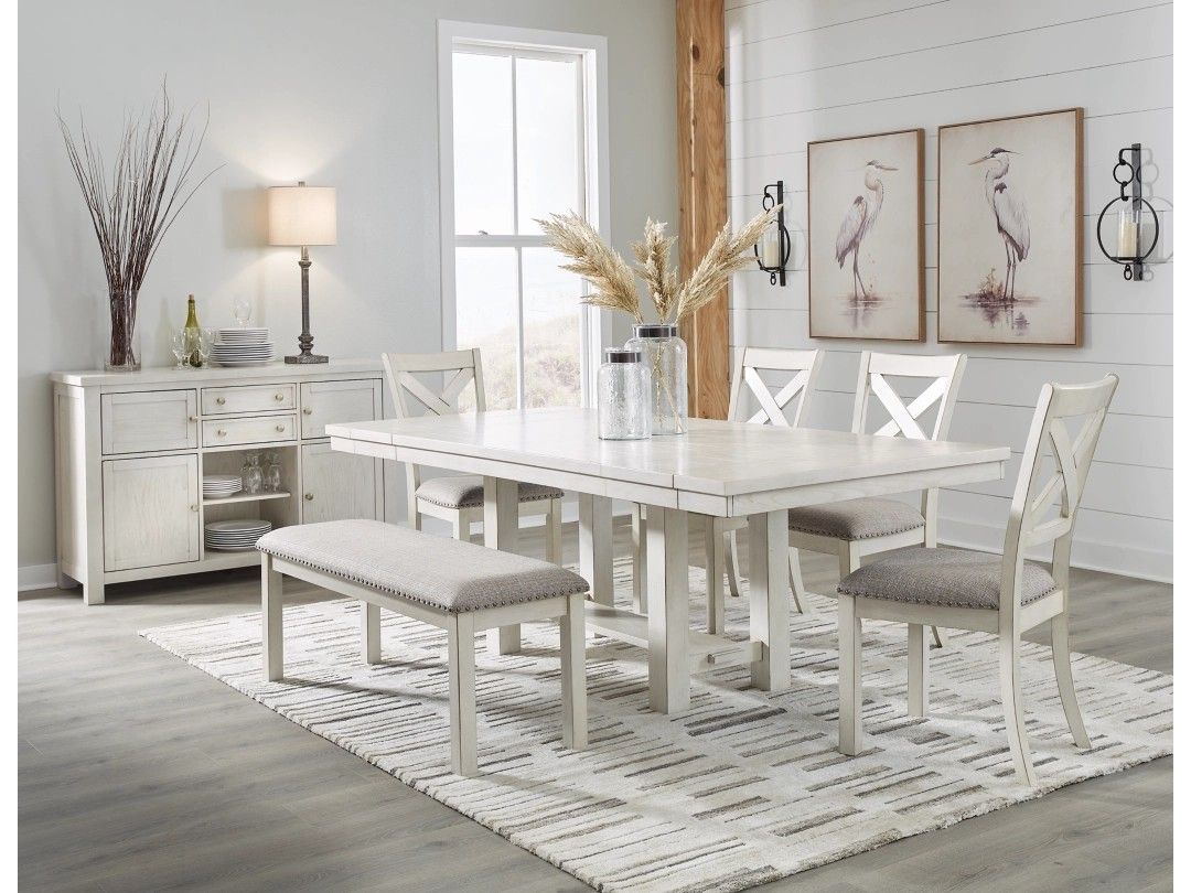 WE CAN DELIVER LOCALLY LIKE NEW! Table. With 2 chairs and two benches. Robbinsdale 48" Dining Bench Made with solid wood frame Antiqued white finish with grain texture Light gray polyester upholstery Two 12" removable center leaves Table extends to 86" overall by pulling both ends and dropping in leaves Seats up to 8 Make me an offer!