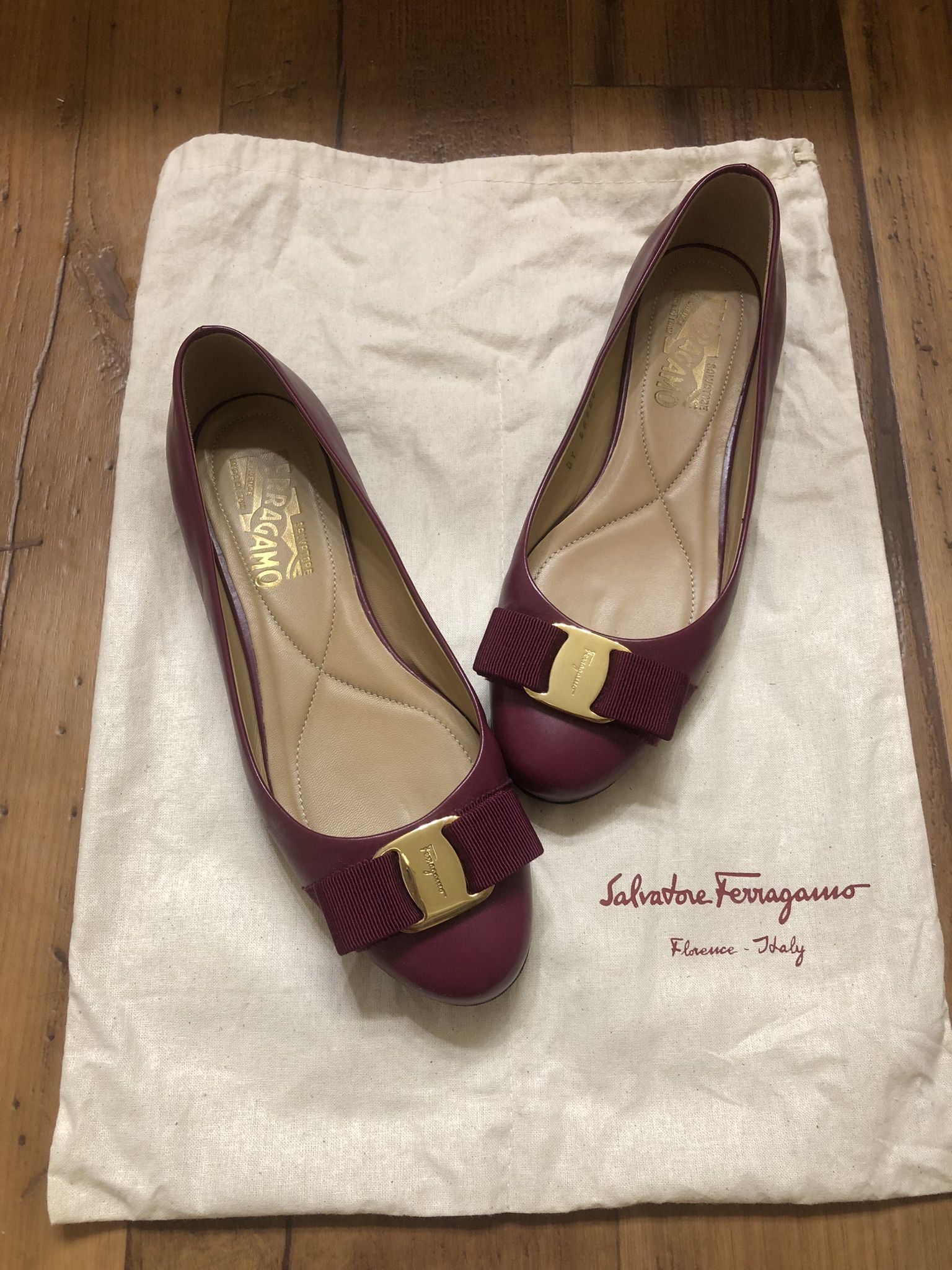 Ferragamo’s most iconic ballet flats that look almost brand new. Worn just once and with sole protector. Both stunning and comfy. Made in Italy. Purchased at Bloomingdale’s. Currently retailed for $780. Size: 6 B Material: genuine leather Color: Corniola (like wine / burgundy). These photos don’t do the shoes justice, the color is more beautiful in person. Condition: great condition like new; worn just once and with no defects. Come with original shoe box and dust bag. Non-smoking home.