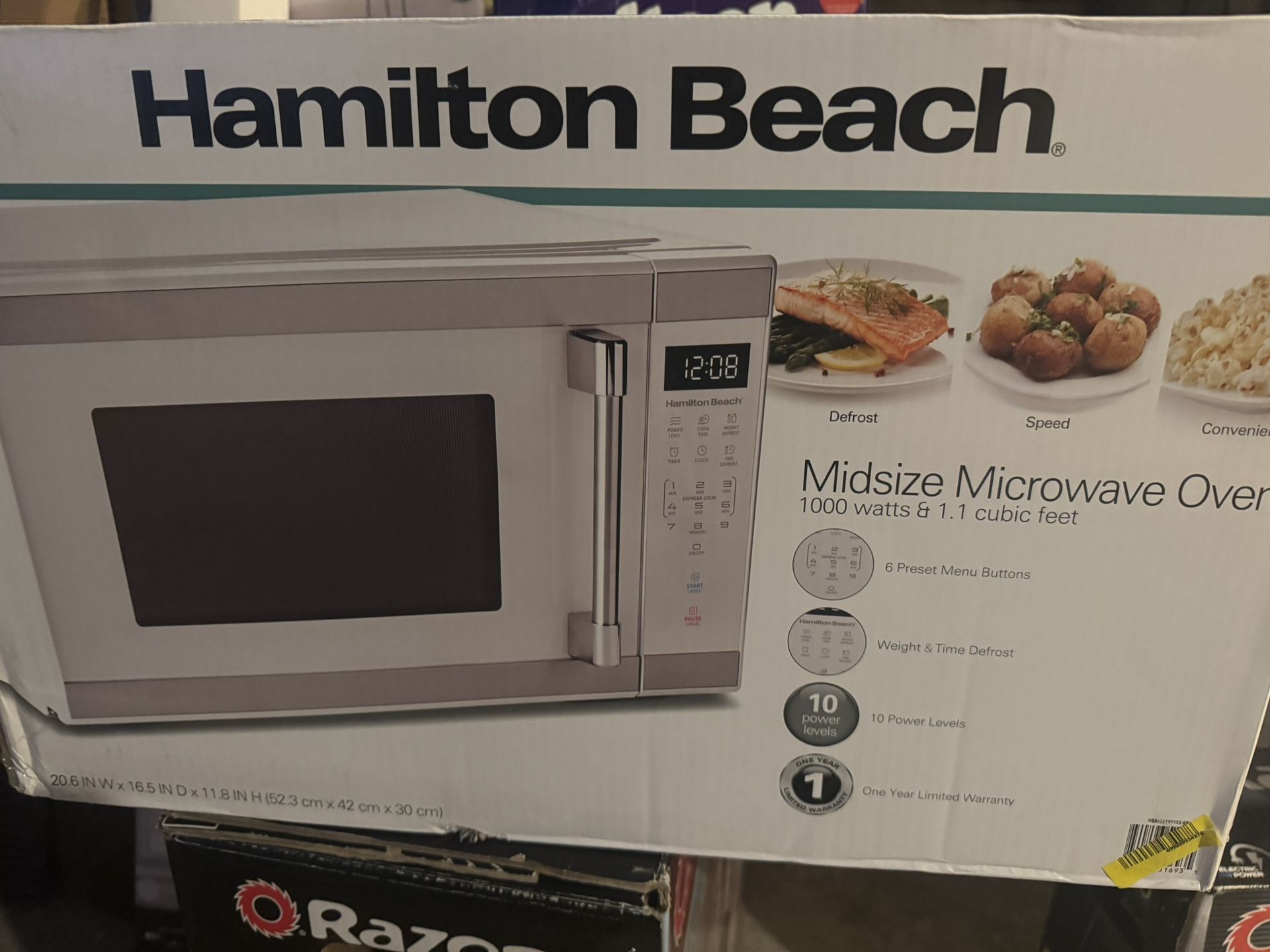 Microondas hamilton color blanco, completamente nuevo, 1.1 pies cúbicos, está grandecito, Hamilton microwave white color, completely new, 1.1 cubic feet, it's big