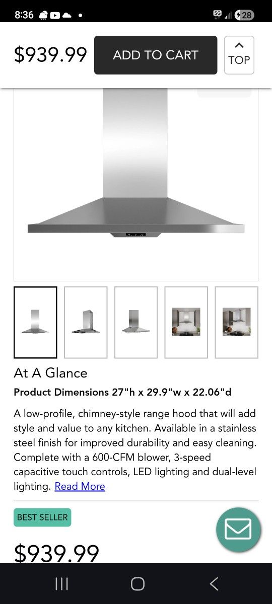 Performance: Features a 600 CFM blower with three speed settings. It includes a CFM Selector, allowing installers to limit the maximum airflow to meet local building codes. Design: A sleek, low-profile chimney shape crafted from stainless steel. It measures approximately 29.9" wide and 22.06" deep. Controls & Lighting: Equipped with capacitive touch controls and dual-level LED lighting. Maintenance: Uses professional baffle filters that are effective at capturing grease. Noise Level: Rated at approximately 6.0 Sones at its standard high setting. Versatility: This is a convertible unit, supporting both vertical venting and ductless recirculation (with an optional kit).