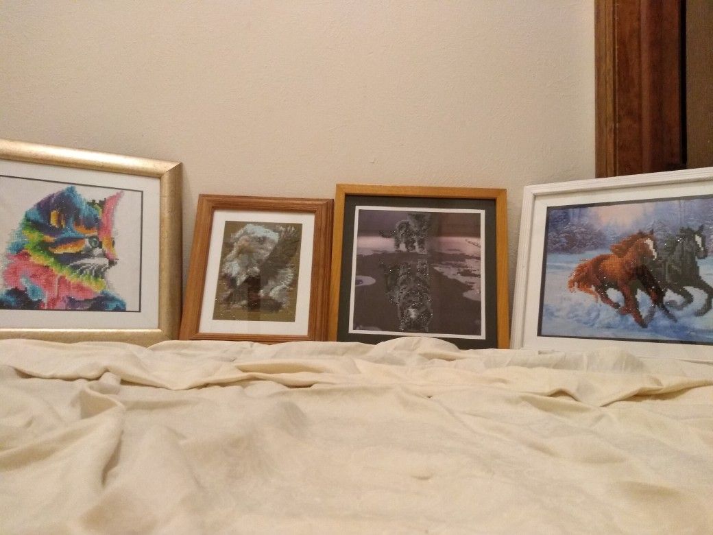 Kitten, tiger 13x13. Eagles 13x10. Calico cat 15x15.