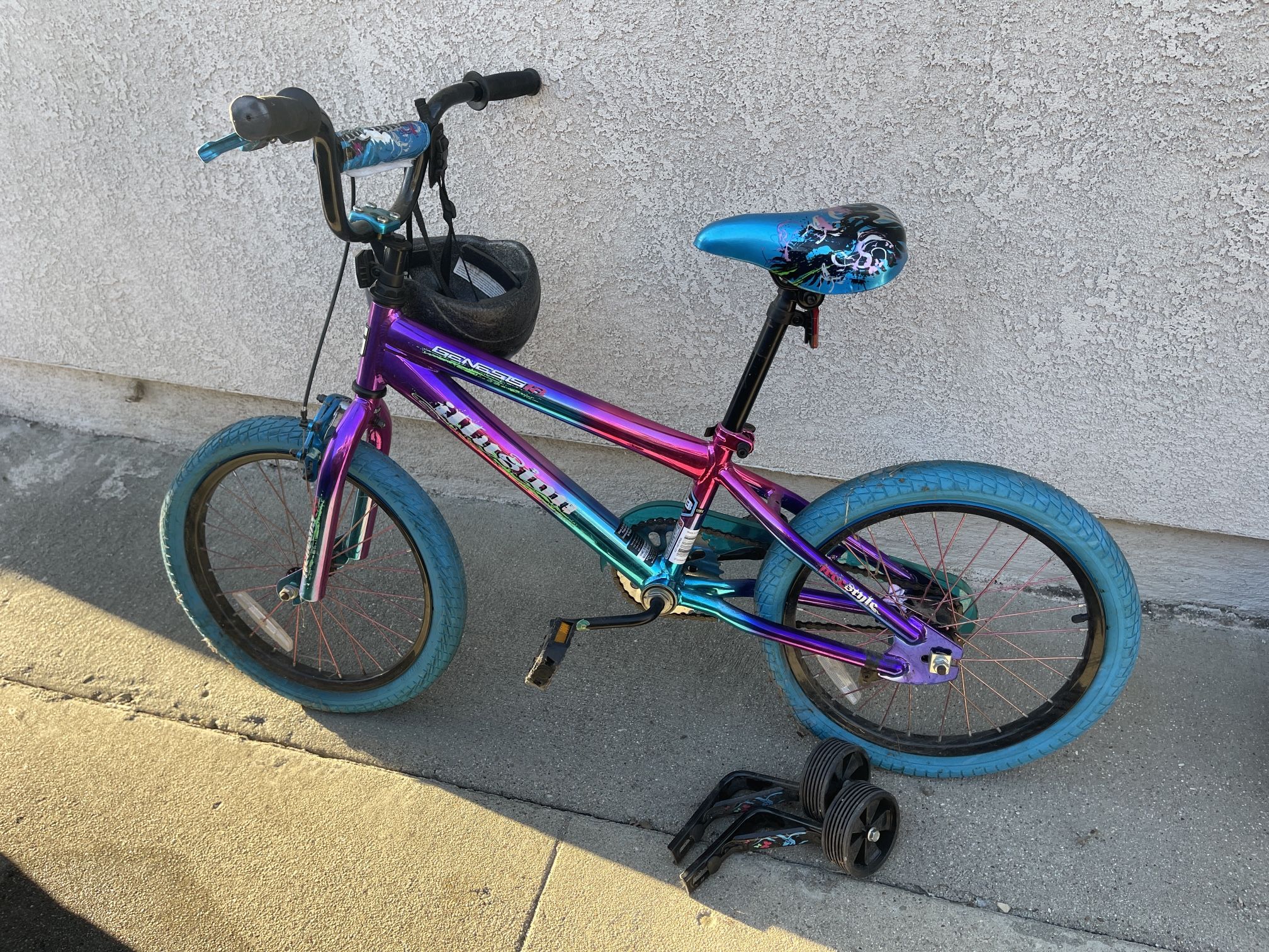 Great condition, includes helmet and training wheels.