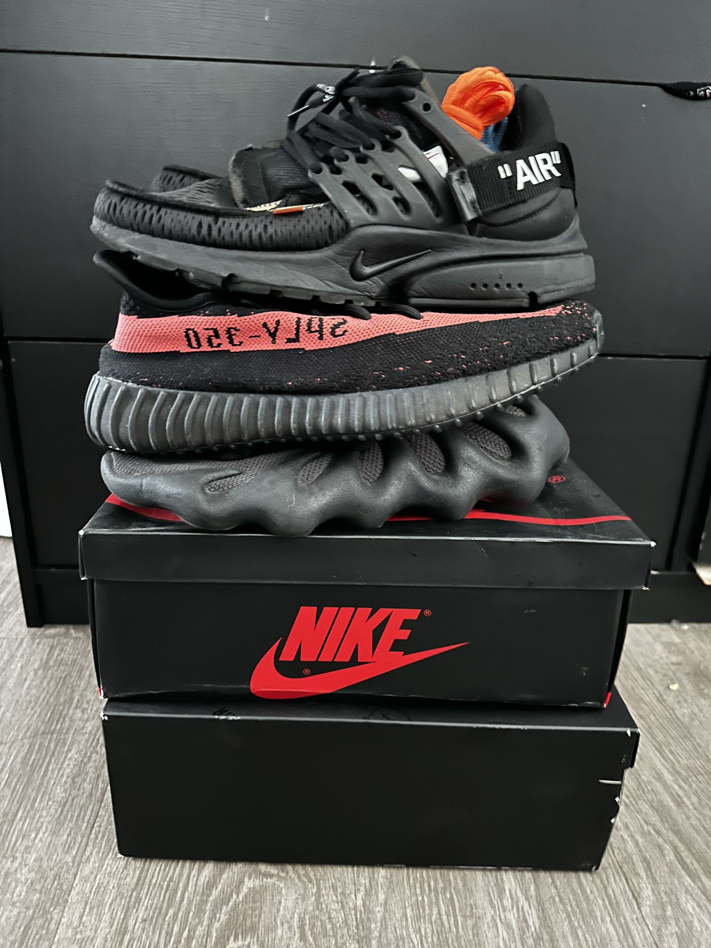 Hey guys I have a few shoes for sale that are just sitting in my closet, if interested shoot me a message and a offer!! Yeezy res stripe size 9.5 no box worn only a few times super clean -SOLD Yeezy 450 black -size 9.5 no box only worn a few times -130 SOLD Travis Scott 1s black size 9 comes with box bandana shoe horns and extra laces pretty worn out but still have some life, good beaters to have just might need some TLC-SOLD Off white prestos - sz 8.5 I’m sure these are reps and not legit but look clean and are worn as well but still have some life, no box just extra laces and plastic tag-150 Jordan 1 bred - sz 9 also believe these are reps and not legit but look clean and only worn a few times. Have the box and are solid to wear without breaking the bank -200 Hit me up for more pictures and if you’re willing to take them all I’ll cut you a deal!!