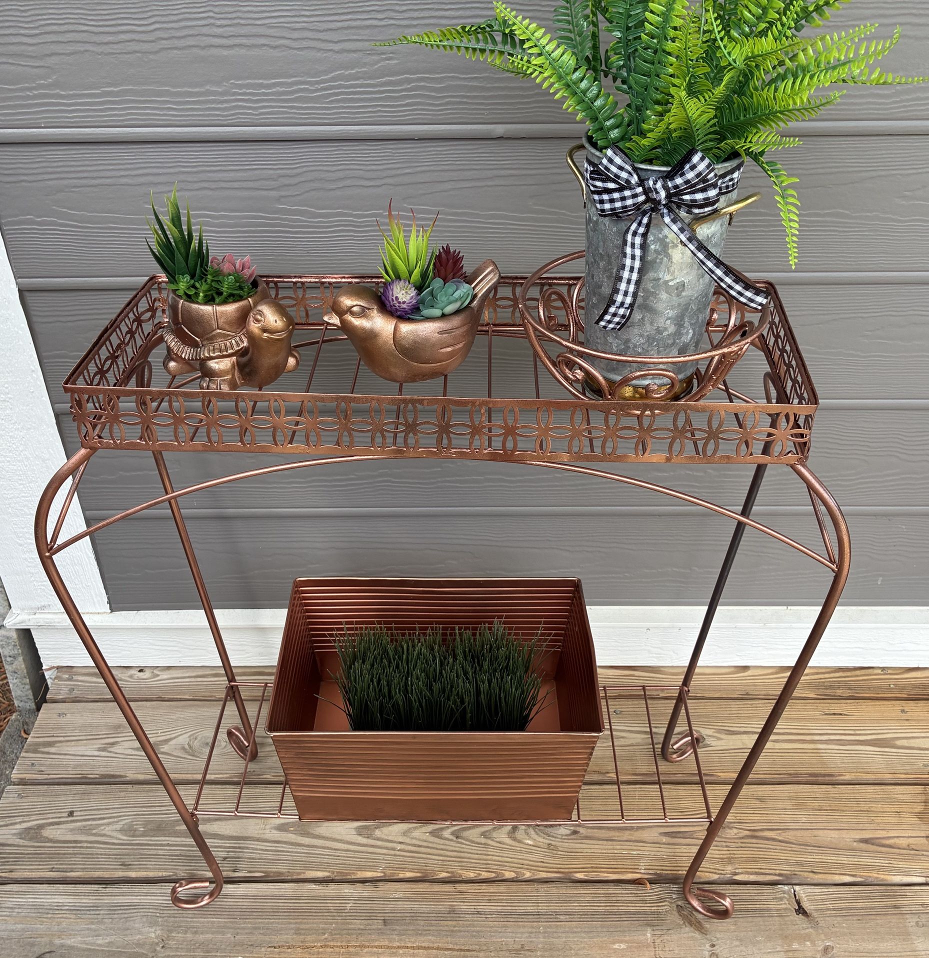 This beautiful bursa trough plant stand would look great with your plants and garden accent items! It has recently been painted with Hammered and Metallic Copper paint and measures 24” l x 28” T x 9” wide. Items on the plant stand are not included in the price but are for sale if interested. Porch pickup in Wake Forest near Target. Accept cash and Venmo.