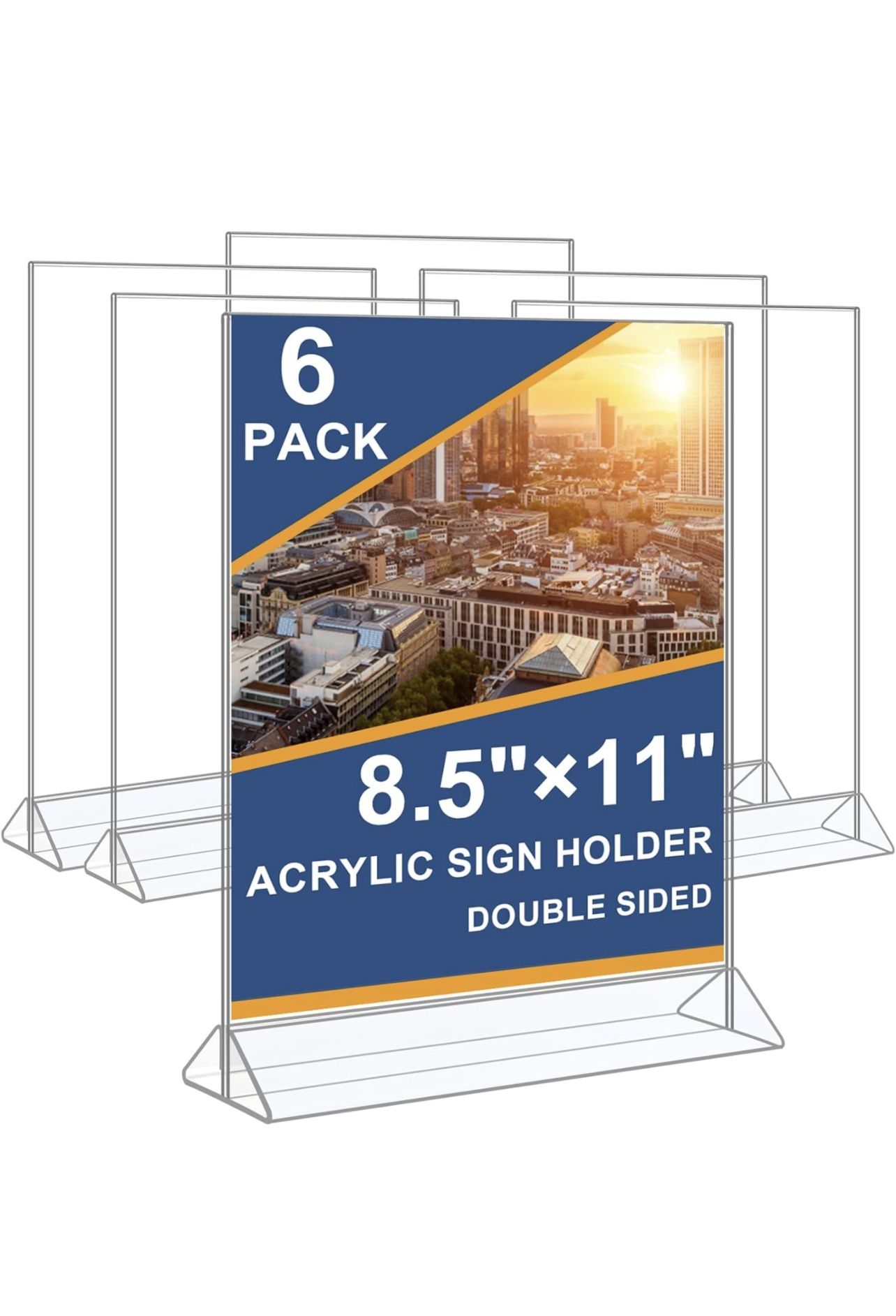 Acrylic Sign Holder 8.5 x 11 Vertical Double-Sided Flyer Display Stands, Plastic Table Menu Stand, Clear Picture Paper Frames for Office Home Store Restaurant 6Pack Product Details Size: 8.5 x 11 inch Quantity: 6 Packs Upright sign Holders Base: Removable triangle base Vertical Clear Sign Holder T shape stand Easy Assemble and change contents; Ready to use out of box (no complicated film); Widen base, more stable than slant sign holder; Double Sided Sign Stand】This acrylic sign holder is designed with a vertical double sided stand, people prefer these double-sided holders rather than slant-back ones. Because clearly and efficiently displays pictures posters and displayed on both sides, unlike the slanted back bracket, which only allows you to display on one side. 📌【Premium Acrylic Material】Our acrylic sign stands are made of high-quality acrylic plastic glass, which can effectively resist falling.Clear acrylic sign holder will not dim or turn yellow under continuous exposure to the sunlight which offers a superb display effect. 📌【Triangular Groove Base】Acrylic sign holder will securely stand by itself vertically on any countertop, desktop, tabletop with its triangular groove base. It will never fall over. Rounded Corner Design, Diamond level polishing, cutting process creates rounded corners and polished edges, which will not cause injuries to your hands. 📌【Widely Used】Each sign holder has an opening on its side and bottom for easy paper insertion.They can display advertisements, menus, flyers and brochures, etc., and can be used in homes, restaurants, offices, wedding scenes, trade exhibitions, and so on.