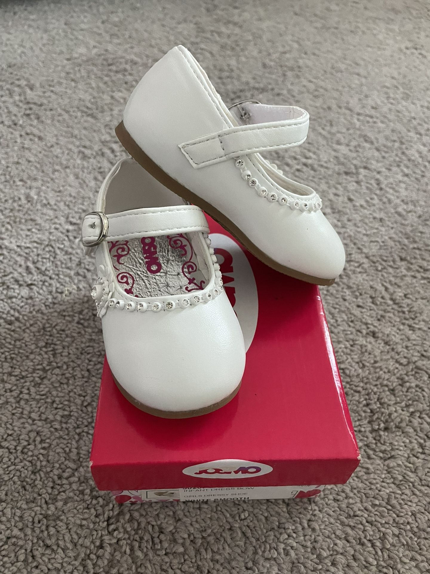NWT & box Josmo baby girl white smooth dress shoes with floral sparkle design on side. Velcro closure as well, sized 4