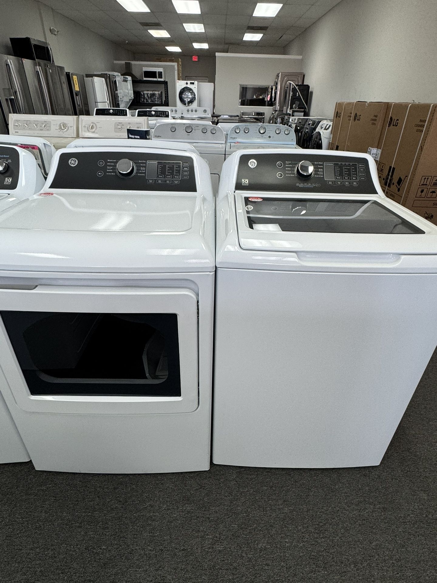 GE washer ran dryer large capacity set new open box We stock washers, dryers, stoves, cooktops, refrigerators, dishwashers and microwaves. Samsung LG Frigidaire Whirlpool Kitchenaid GE Maytag and Bosch We carry new open box, used and scratch and dent appliances 1 year warranty new open box appliances delivery and installation available