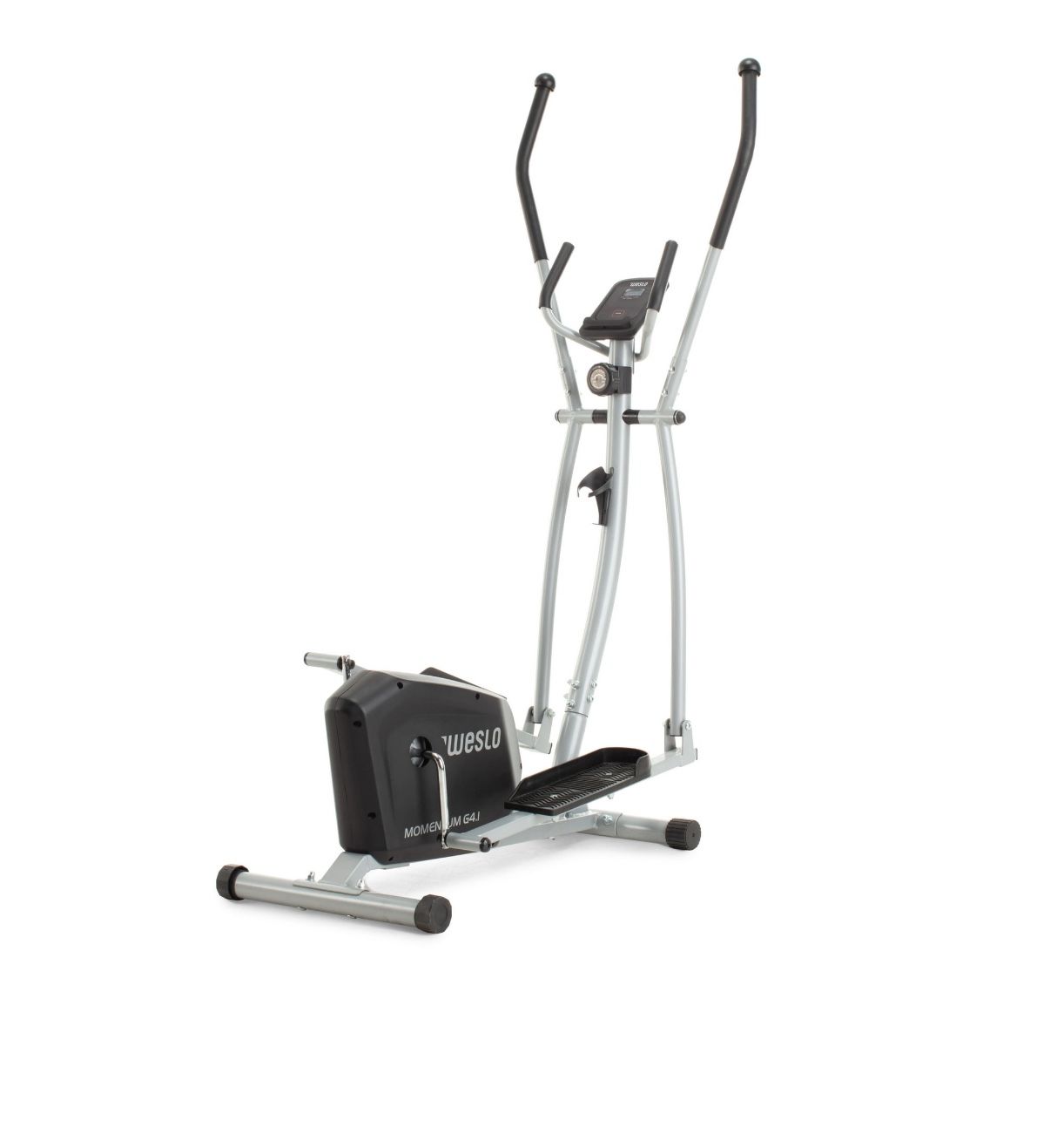 The Weslo Momentum G 4.1 rear-drive elliptical is perfect for training your cardiovascular health, rehabilitating after an injury, or exercising while watching T.V. Featuring a 12" elliptical stride length, this machine will comfortably fit users of most heights. Conveniently adjust your elliptical's SMR silent magnetic resistance to choose the difficulty that best suits you. Track your workout stats on the built-in LCD window that constantly displays your speed, time, distance, calories, and rpm. Stay entertained with the integrated tablet holder. An inertia-enhanced flywheel delivers a smooth, quiet ride every time you use it. Step-thru design makes it easy to get on and off your machine without a hassle. When you are finished with your workout or need to free up some floor space, easily move your elliptical out of the way with the built-in transport wheels.