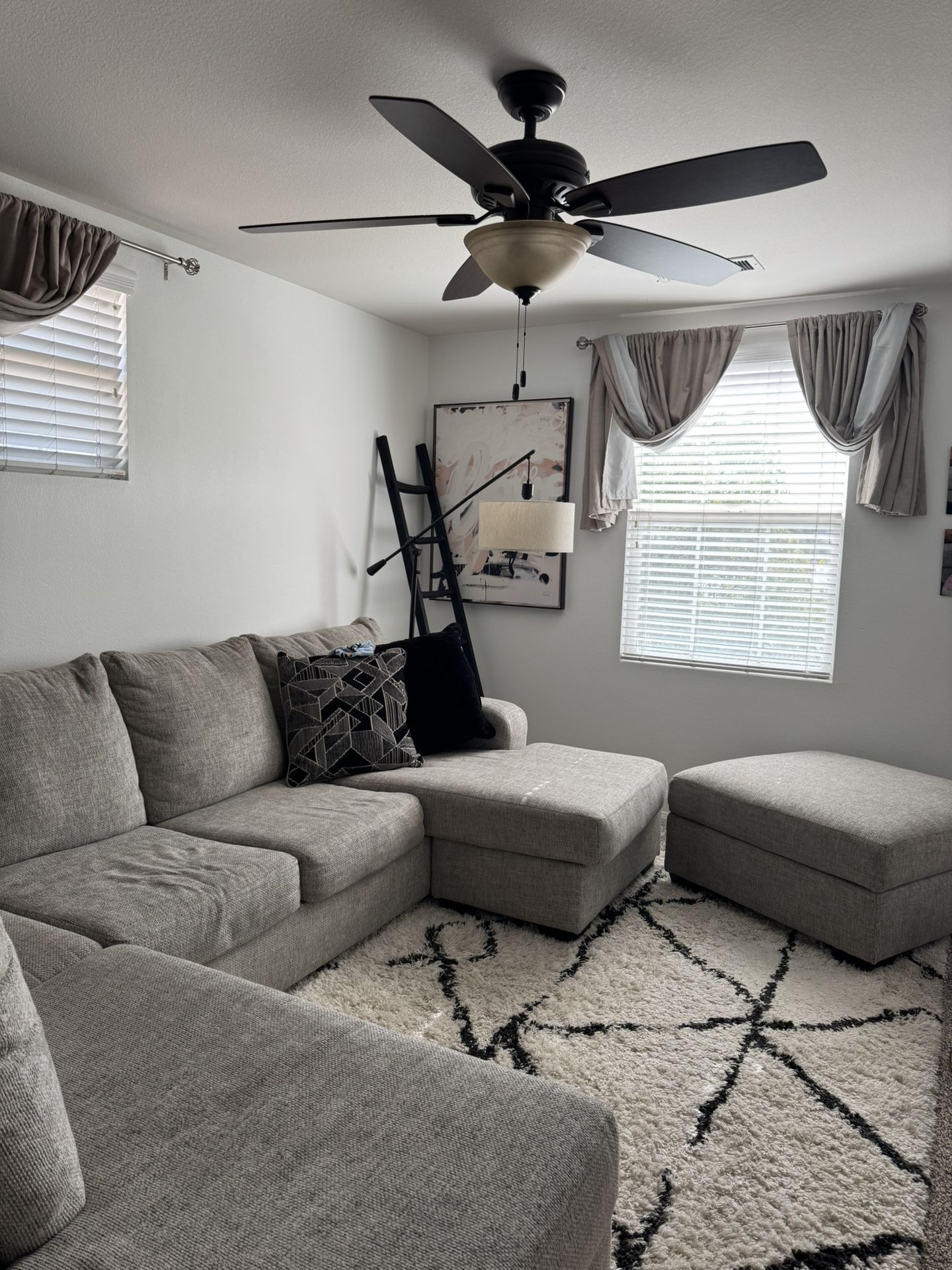 Light grey tweed sectional 124”W x 35”H x 87”D with matching storage ottoman 35.5 x 35.5 for sale $300.00 obo Will throw in area rug and lamp for free if wanted