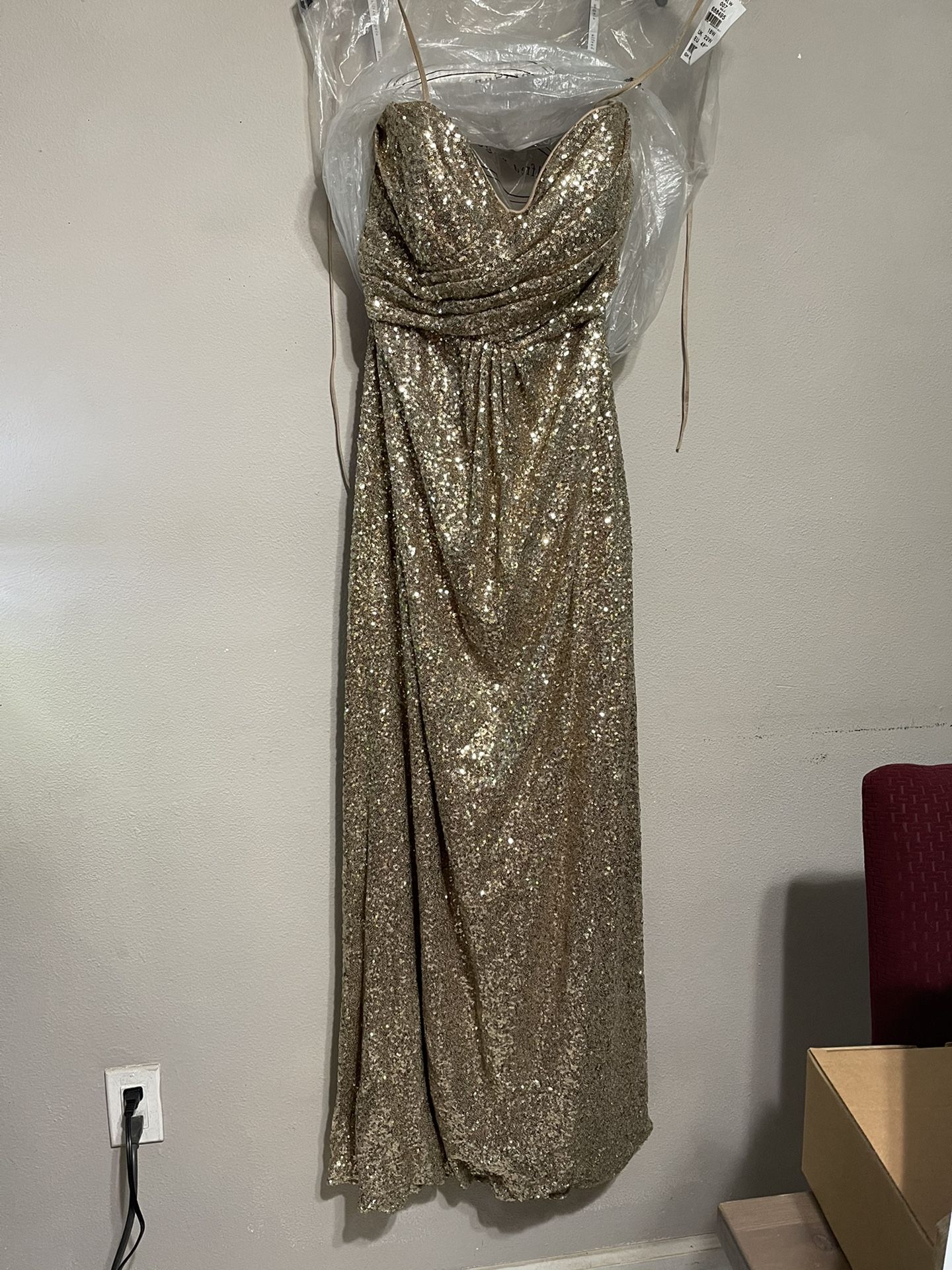 Beautiful gold Alfred Angelo dress. Used once and never altered or tailored. It has some weight to it and it has a mini corset underneath the bust. I got a bunch of compliments when I wore it.