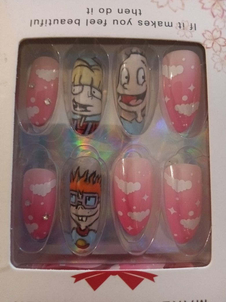 Hand painted 3 Rugrats accent nails and put them together with a press on kit that includes file, glue dabs and fill. I didn't paint the rest of the nails just the Rugrats. Brand new I can also customize any animation you're interested in . I can also deliver nail services msg me for details