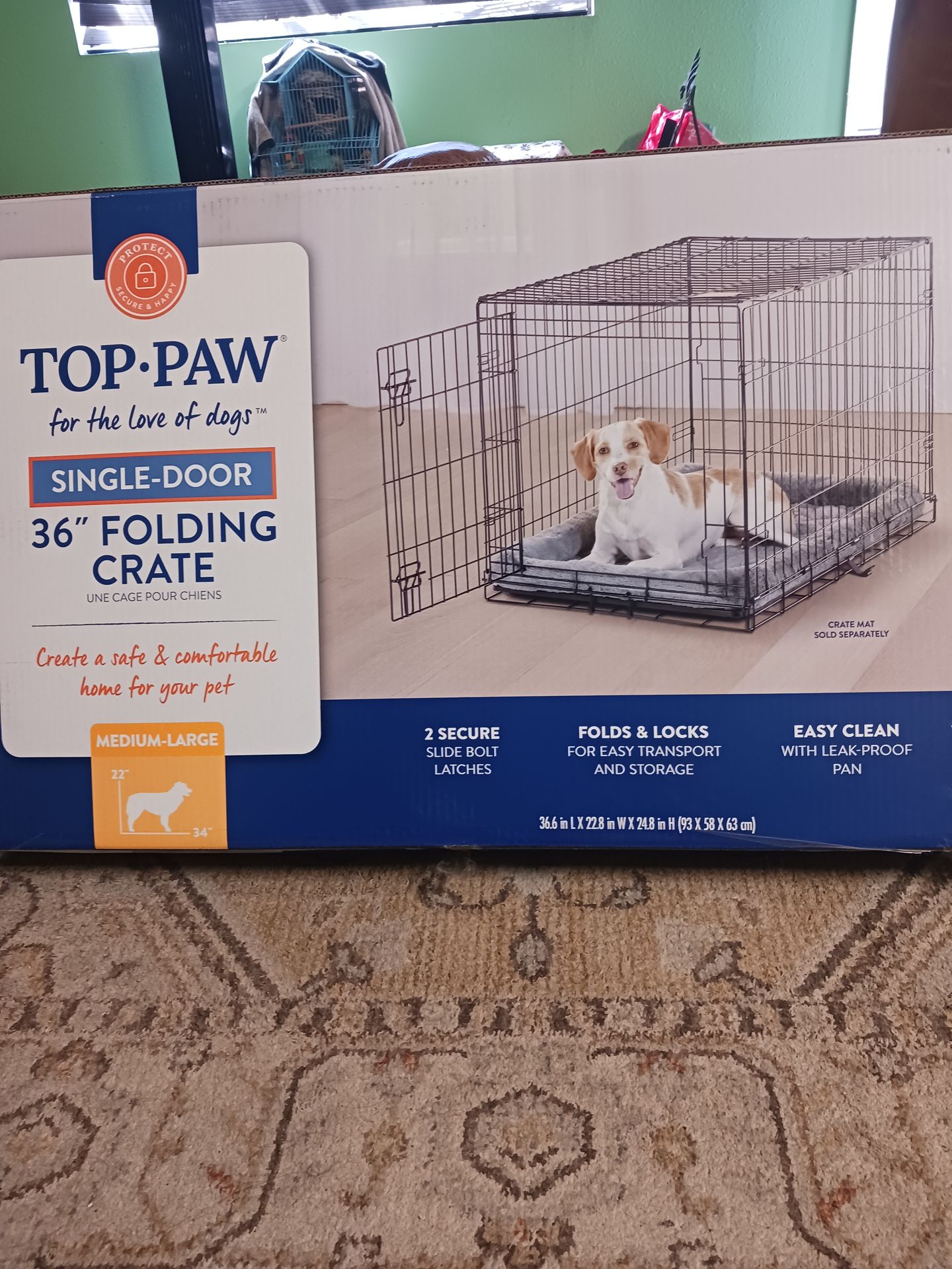 TOP- PAW. Single Door 36" Folding Dog Crate. In Good Condition Only Used Twice Like Brand New. 2 Secure Slide Bolt Latches,It Folds And Locks For Easy Transport And Storage With Easy Clean Leak- Proof Pan. For Medium To Large Dog. MEASUREMENTS- 36.6in L X22.8 in W X 24.8 in H ( 93X58X63 cm)