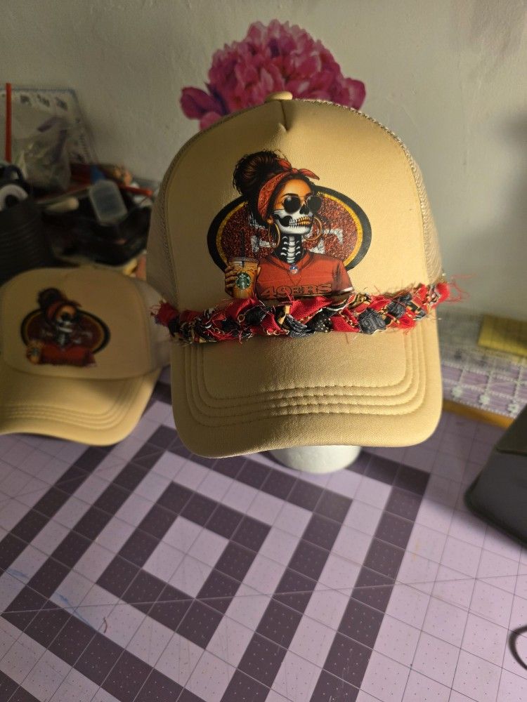 Beige snap back trucker hat with 49er Skully Girl image and handmade matching brade.