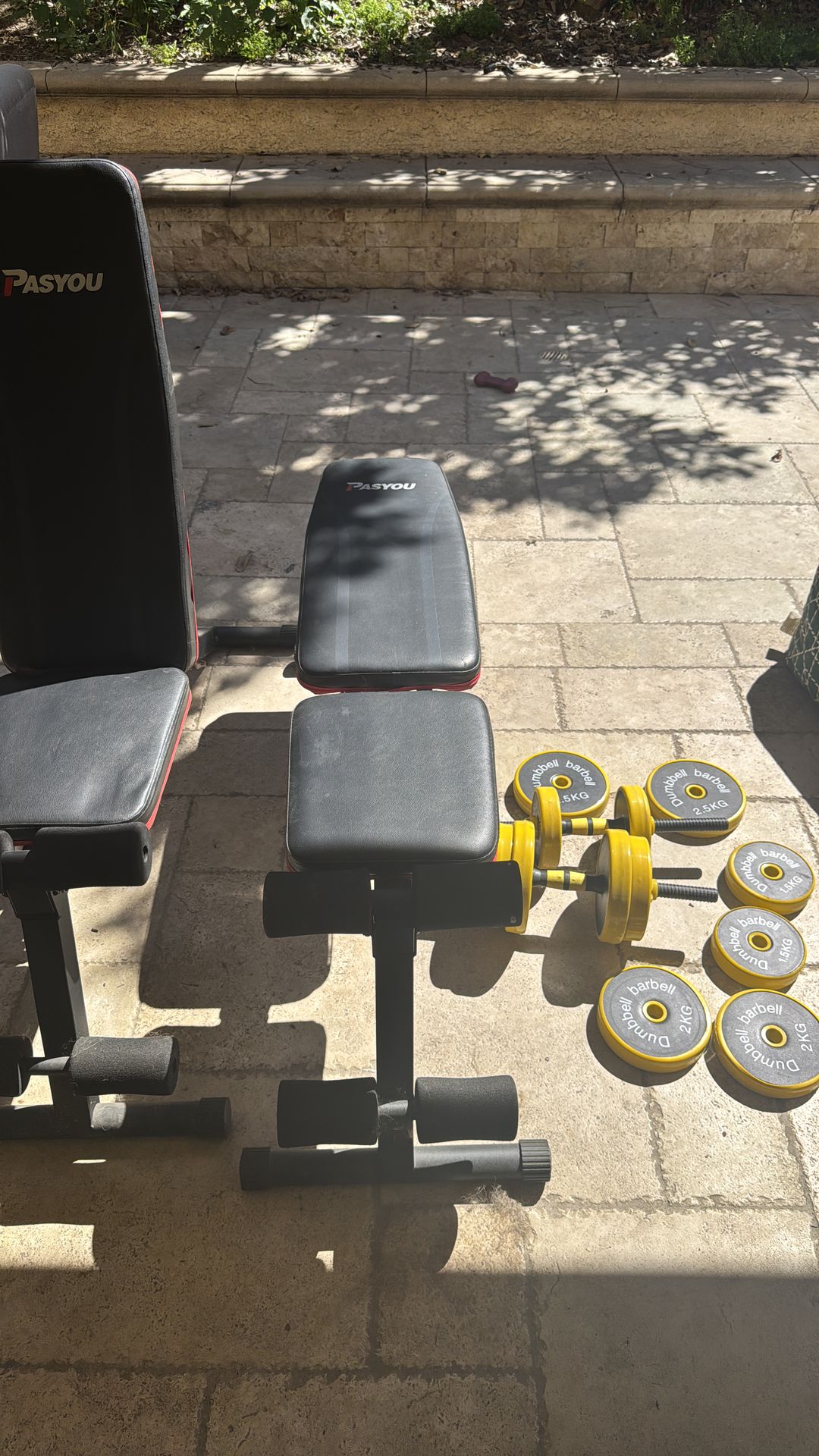 Weight Set: Includes adjustable dumbbell bars and several weight plates (2.5KG, 2KG, 1.5KG) as shown in the photo. Vehicle Required: This set includes TWO full-size weight benches. A Large SUV, Minivan, or Pickup Truck is highly recommended to fit everything in one trip.