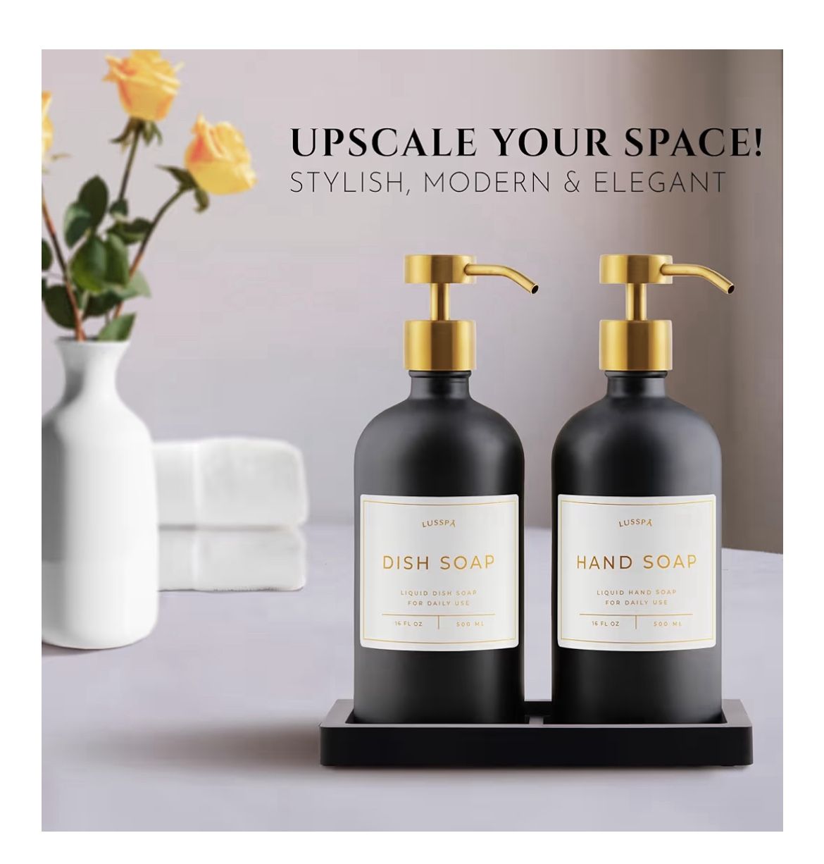 Beautiful set of black and gold soap dispensers. Classy and clean look! Get a bundle deal when you buy another item from my listings!