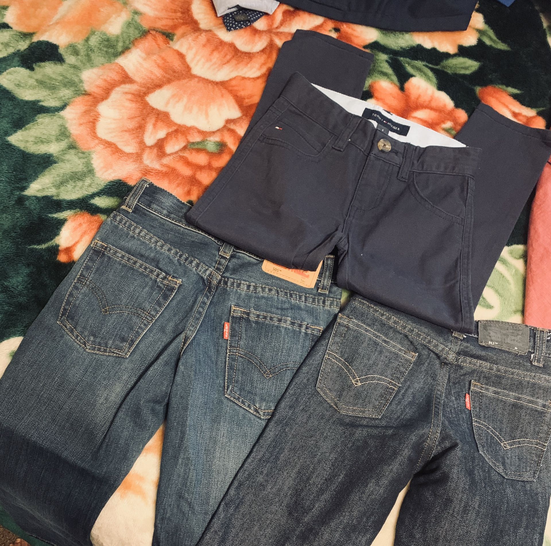 I have 2 jeans 501 for kids one is 5T and the other one is 4T .. Tommy hilfiger is size 4 there all pretty brand new im selling all 3 for 30 bucks or if you want 1 only there 10.00 each