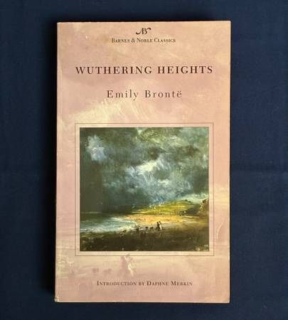 This is a paperback book, Wuthering Heights by Emily Bronte. It is a Barnes & Noble Classics edition from 2004 and includes an introduction by Daphne Merkin. Book is in nice used condition and shows only very light wear. I did see one page that had a folded corner, and I thought I saw a small pen mark on another page but I couldn't find it again. No other issues to mention.