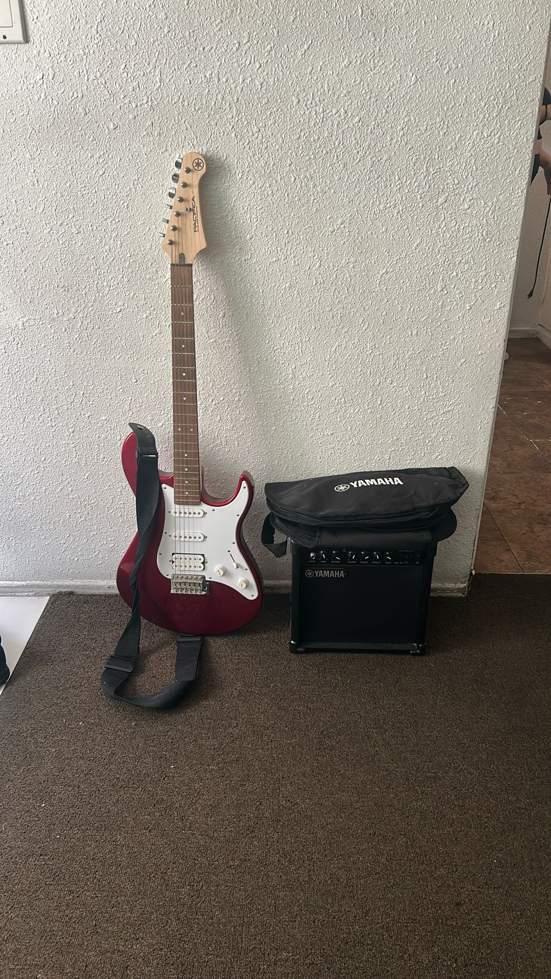 Red Yamaha electric guitar