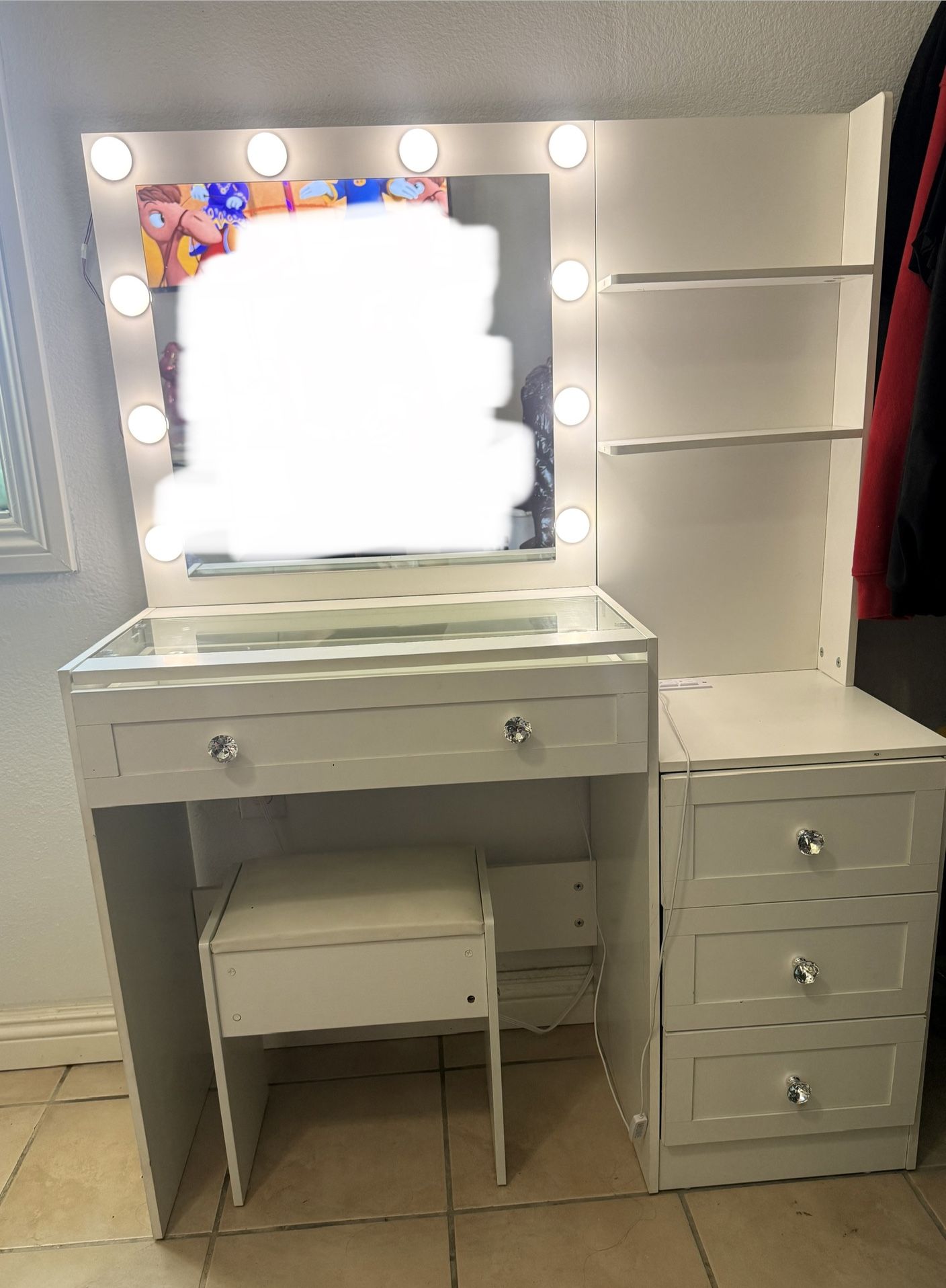 can get with vanity stool for 10$ some makeup stains but overall a good vanity. can’t really notice anything
