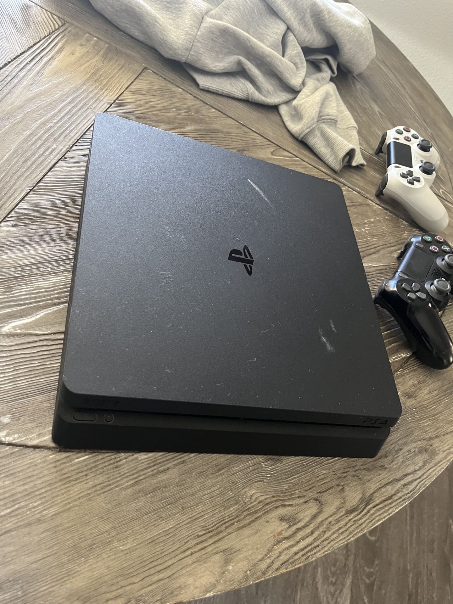 PS4 Slim - Overall Good Condition apart from White Mark on the top White Controller - Decent Condition, X button is a little pushy Black Controller - Decent Condition, buttons work it’s just a little more worn