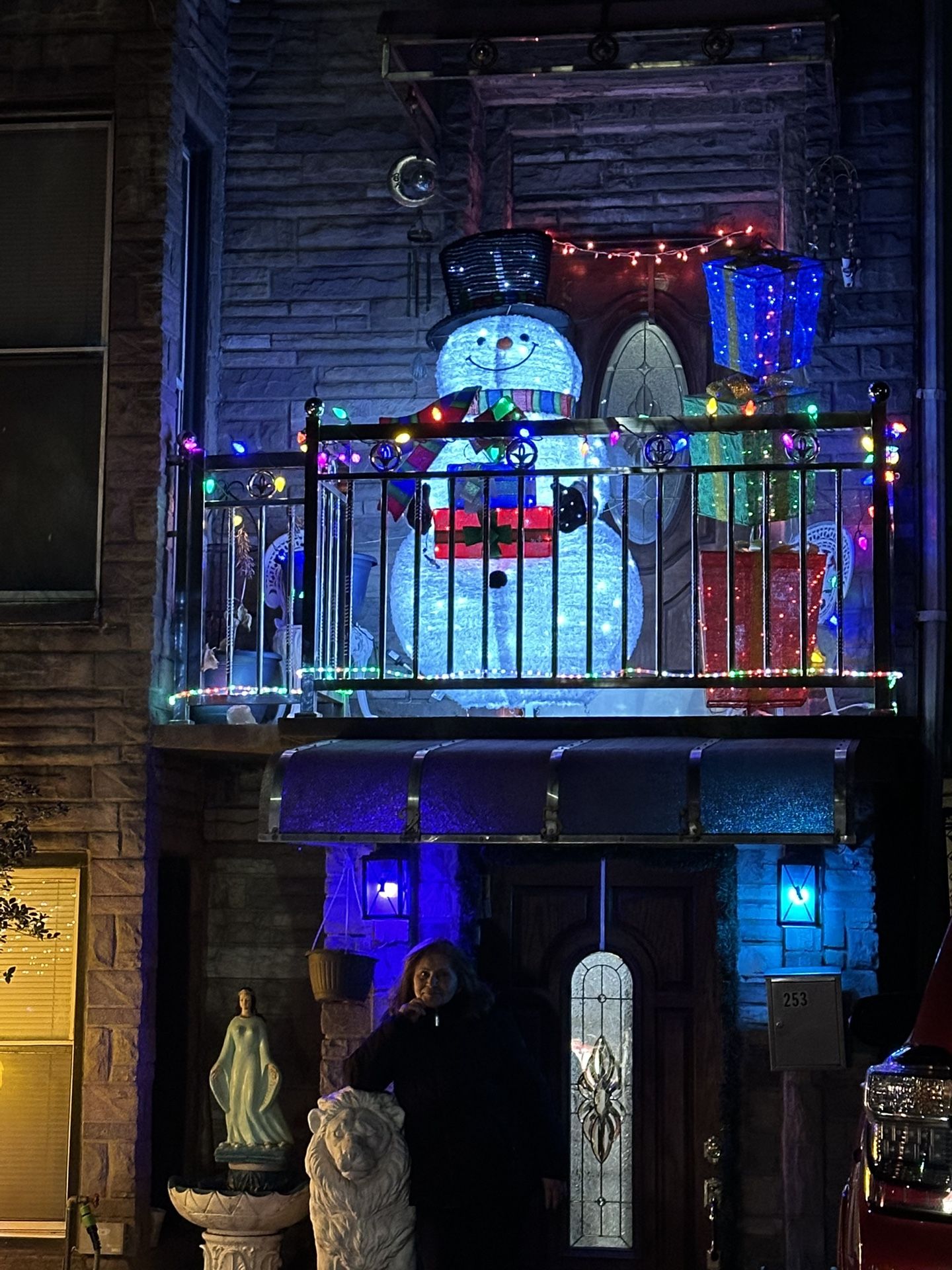 Big white soft well light snowman over 5’ tall and is 36 inch wide.