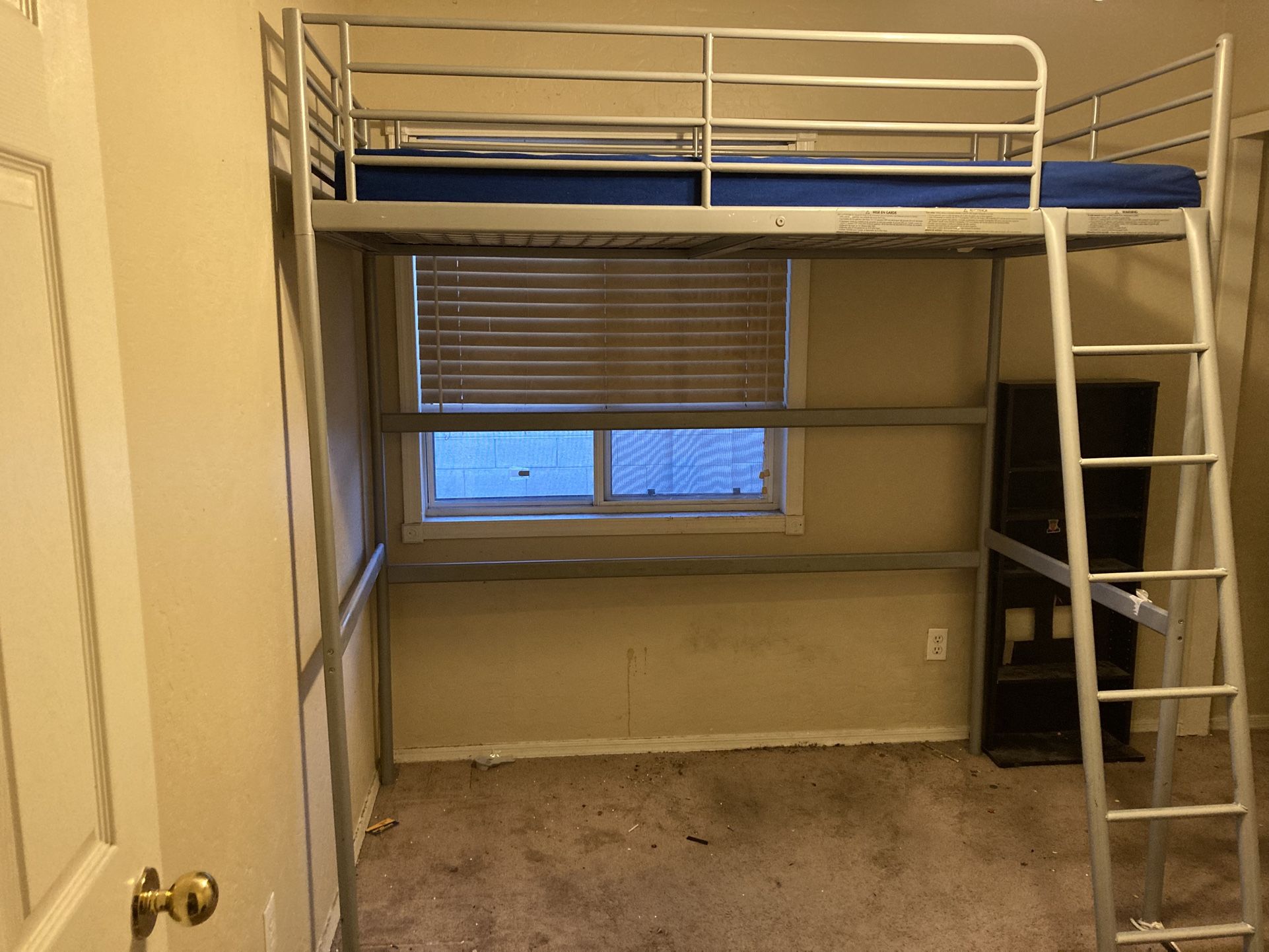 Metal loft bed for kids. Size of a twin bed. About 5 feet off the ground, it allows for storage or play underneath. Ladder has small steps for short legs, but there is no protection or grip. Mattress included. (Twin size)